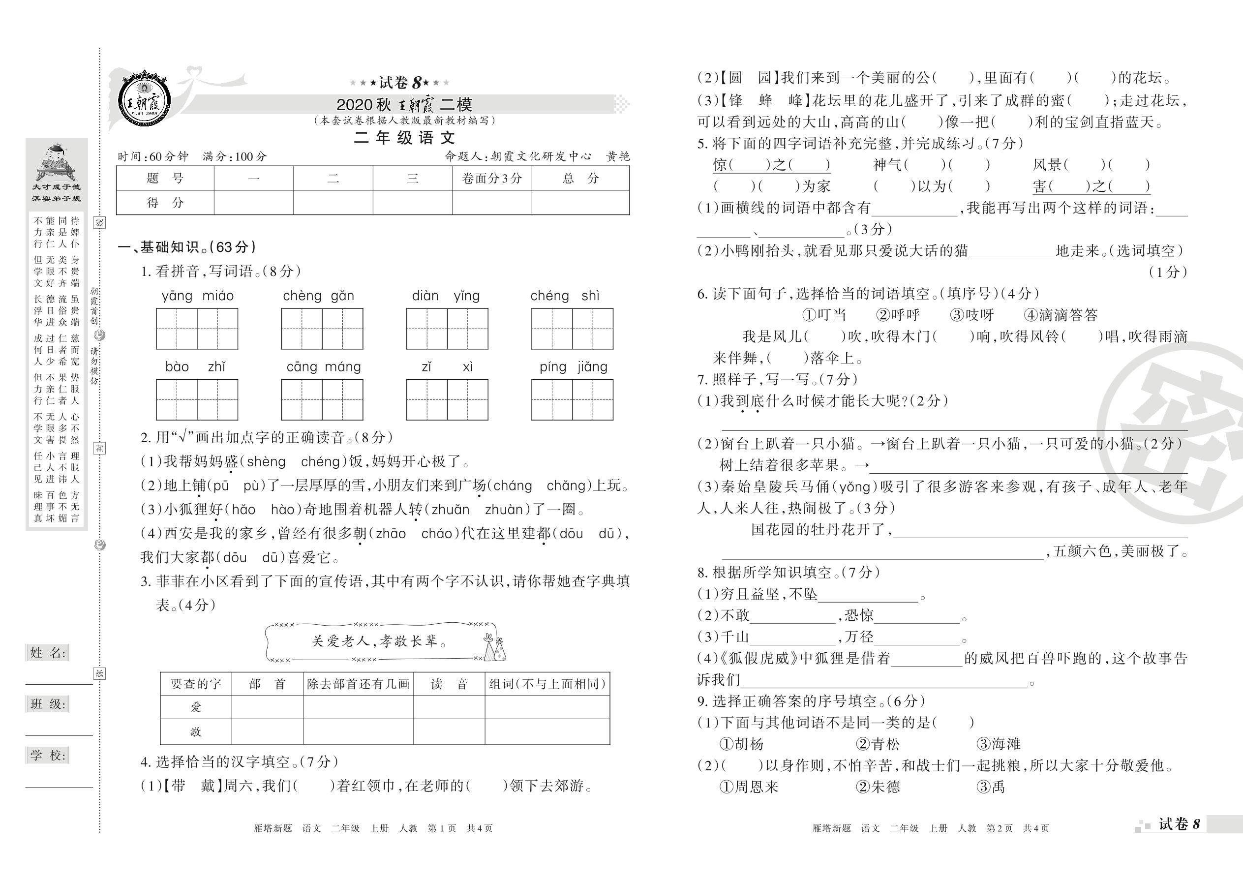 王朝霞期末模拟卷二年级上册语文(人教版)_R21080164119【8】