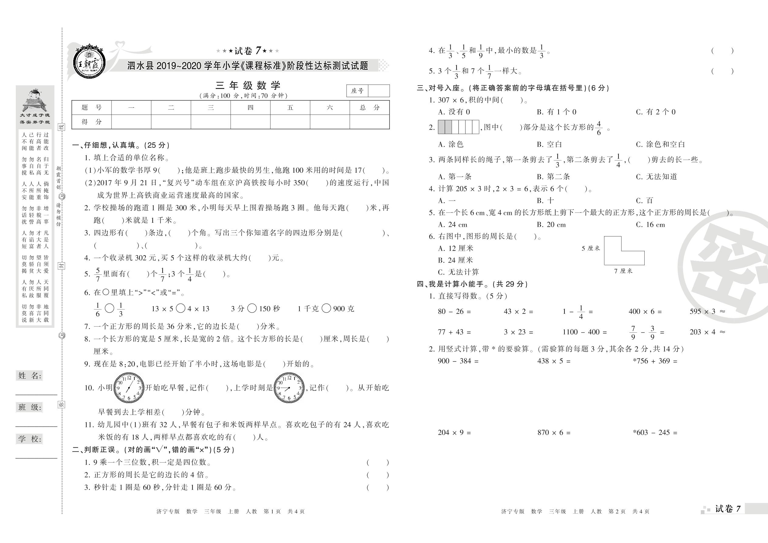 2019-2020学年第一学期济宁市泗水县三年级数学试卷(人教版)【7】