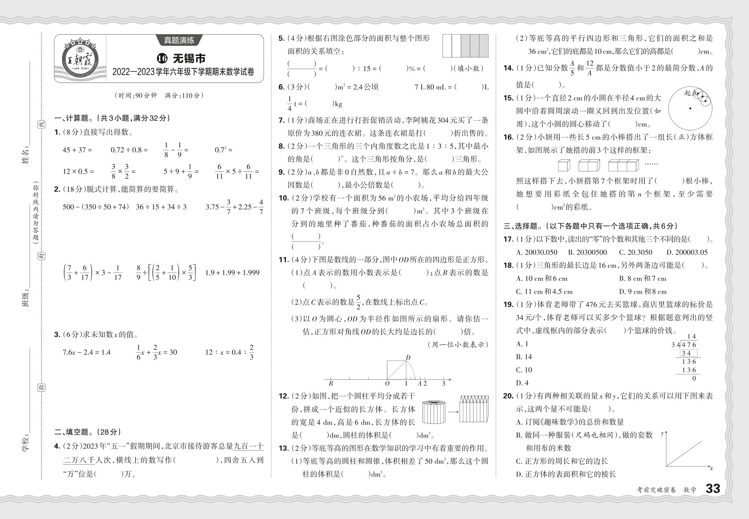 小升初数学·江苏省无锡市2022—2023学年六年级下学期期末数学试卷【16】
