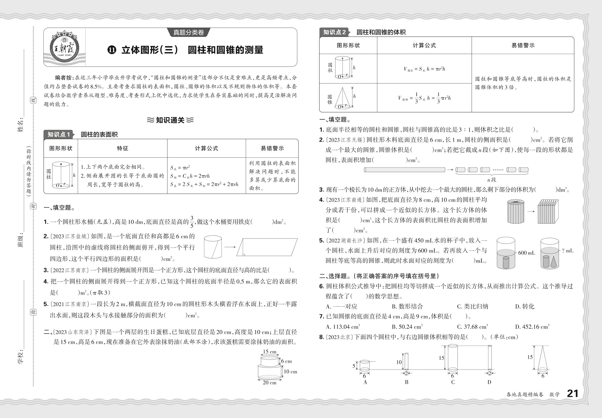 小升初数学·2024年真题分类卷——立体图形(三) 圆柱和圆锥的测量【11】