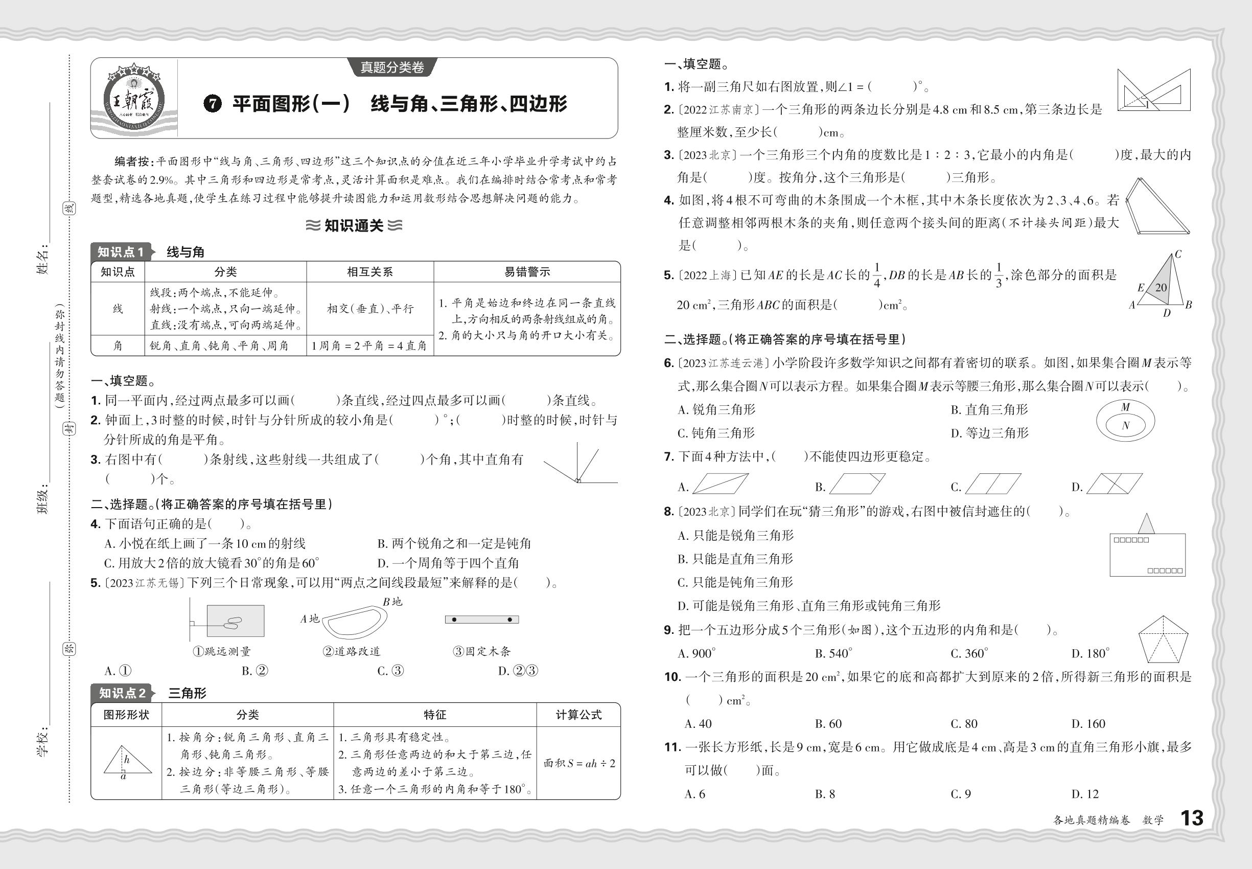 小升初数学·2024年真题分类卷——平面图形(一) 线与角、三角形、四边形【7】