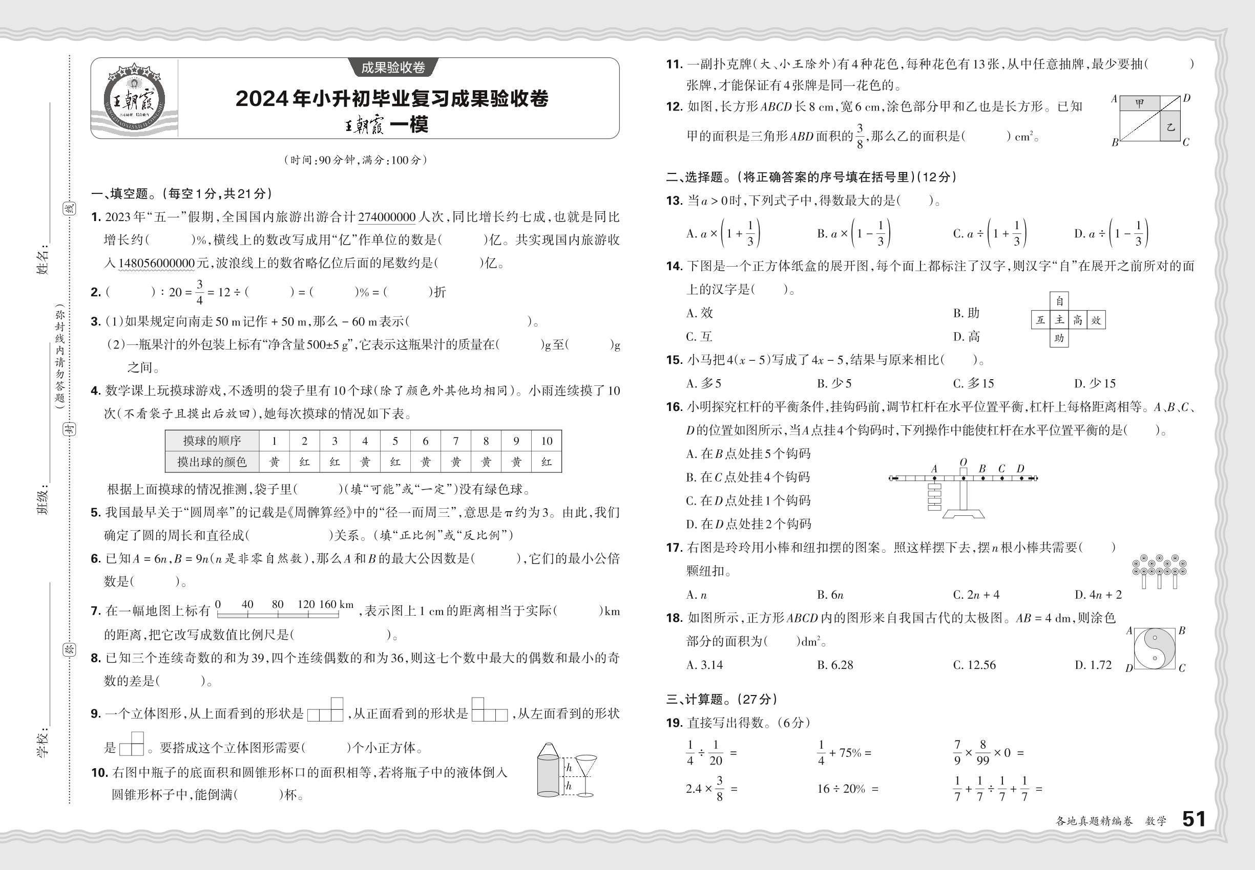 2024年小升初数学毕业复习成果验收卷·王朝霞一模