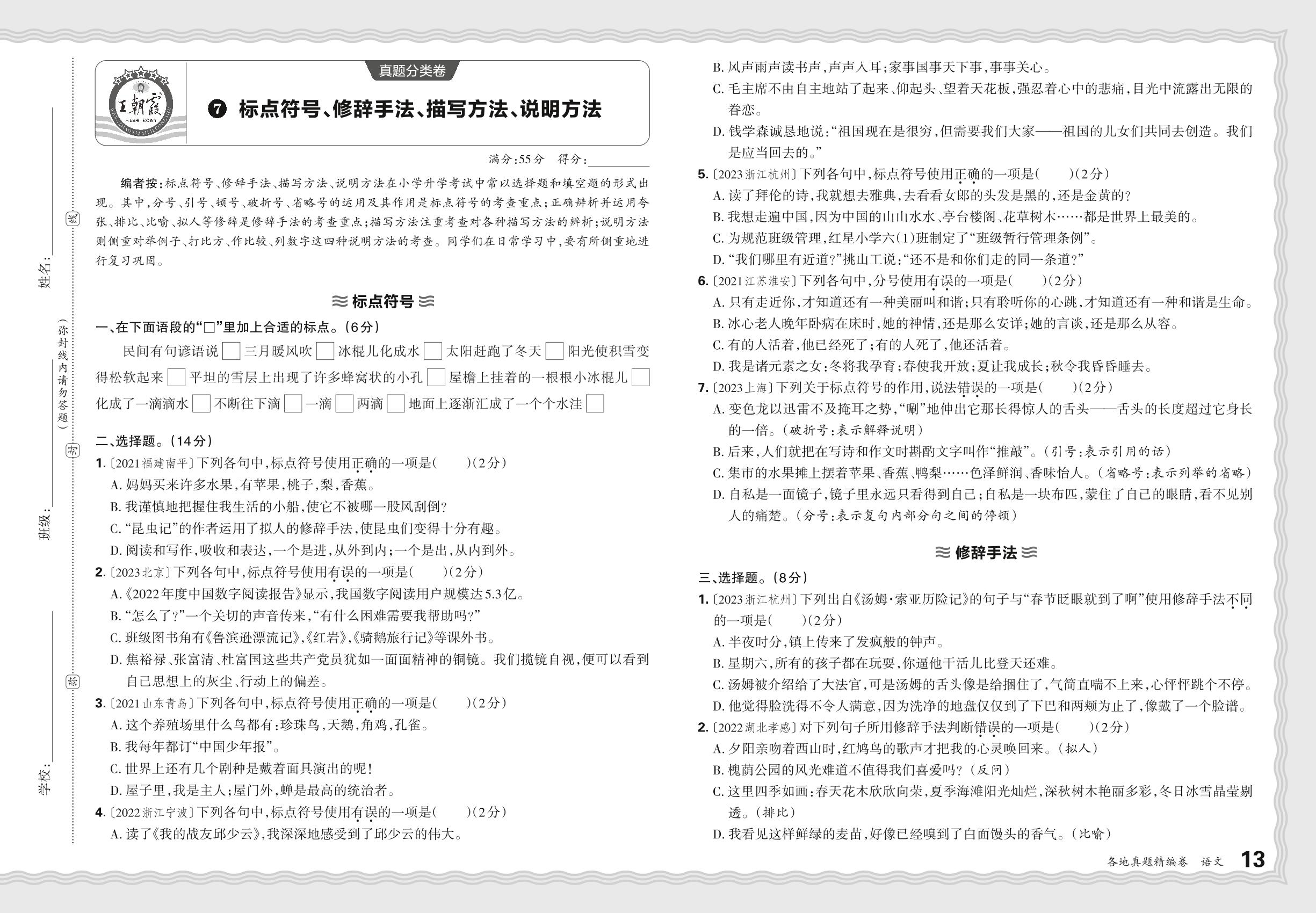 小升初语文·2024年真题分类卷——标点符号、修辞手法、描写方法、说明方法【7】
