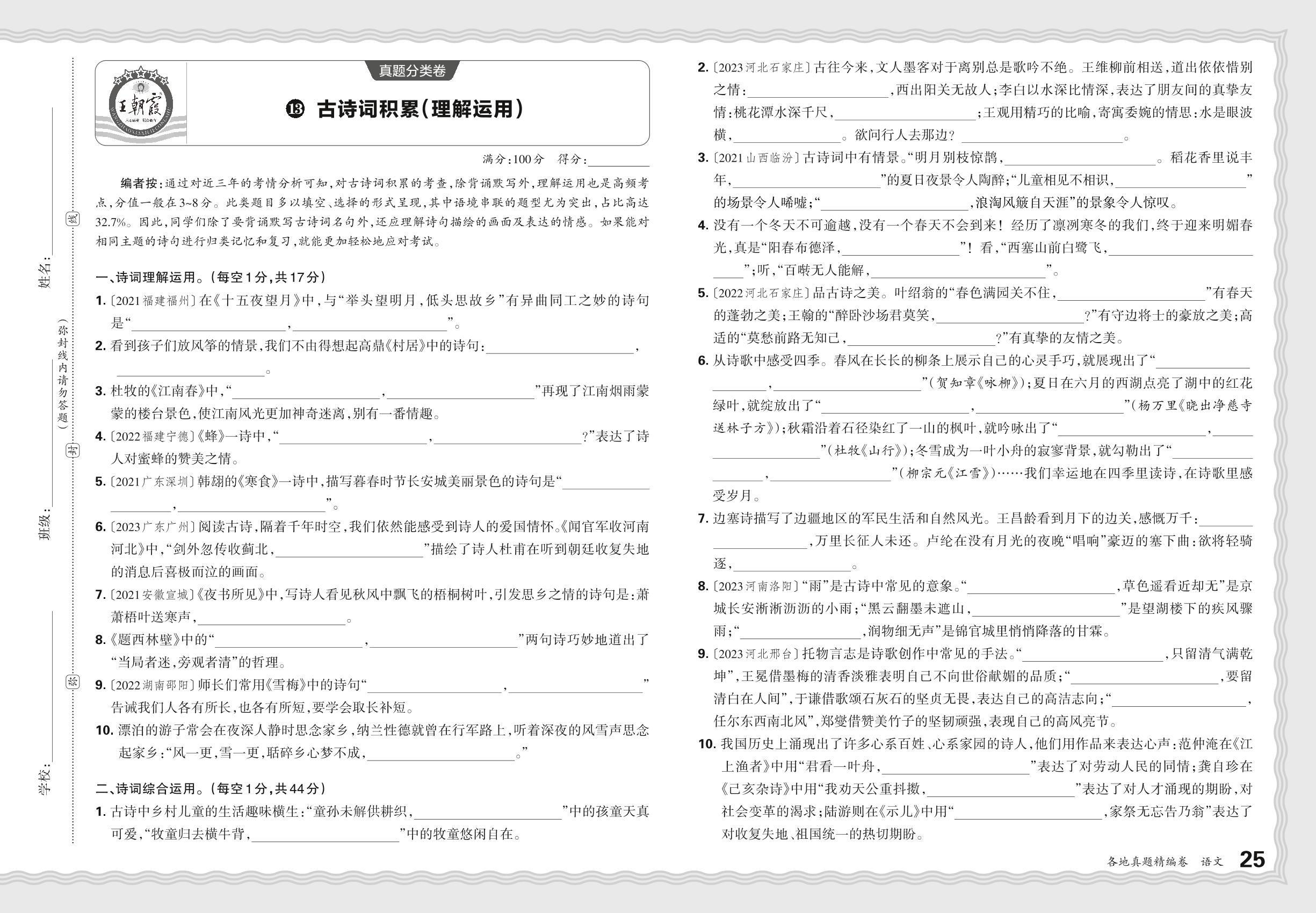 小升初语文·2024年真题分类卷——古诗词积累(理解运用)【13】