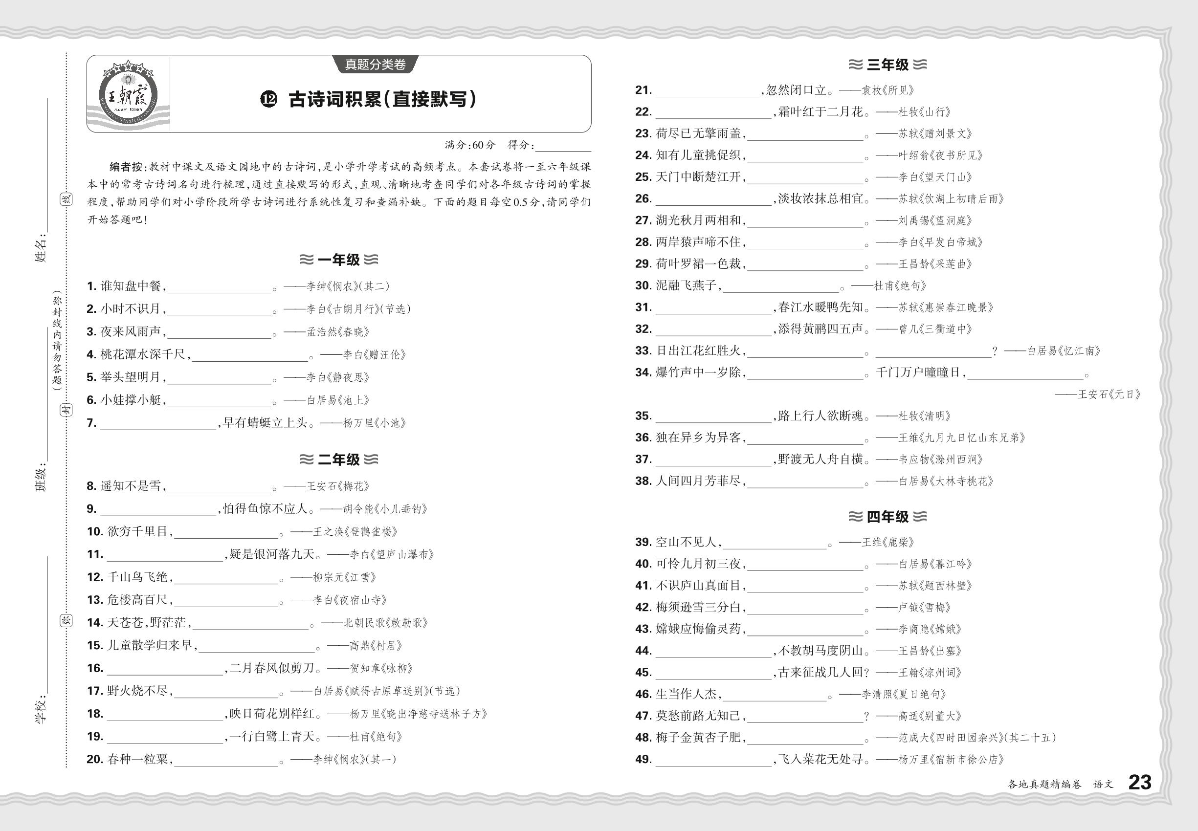 小升初语文·2024年真题分类卷——古诗词积累(直接默写)【12】