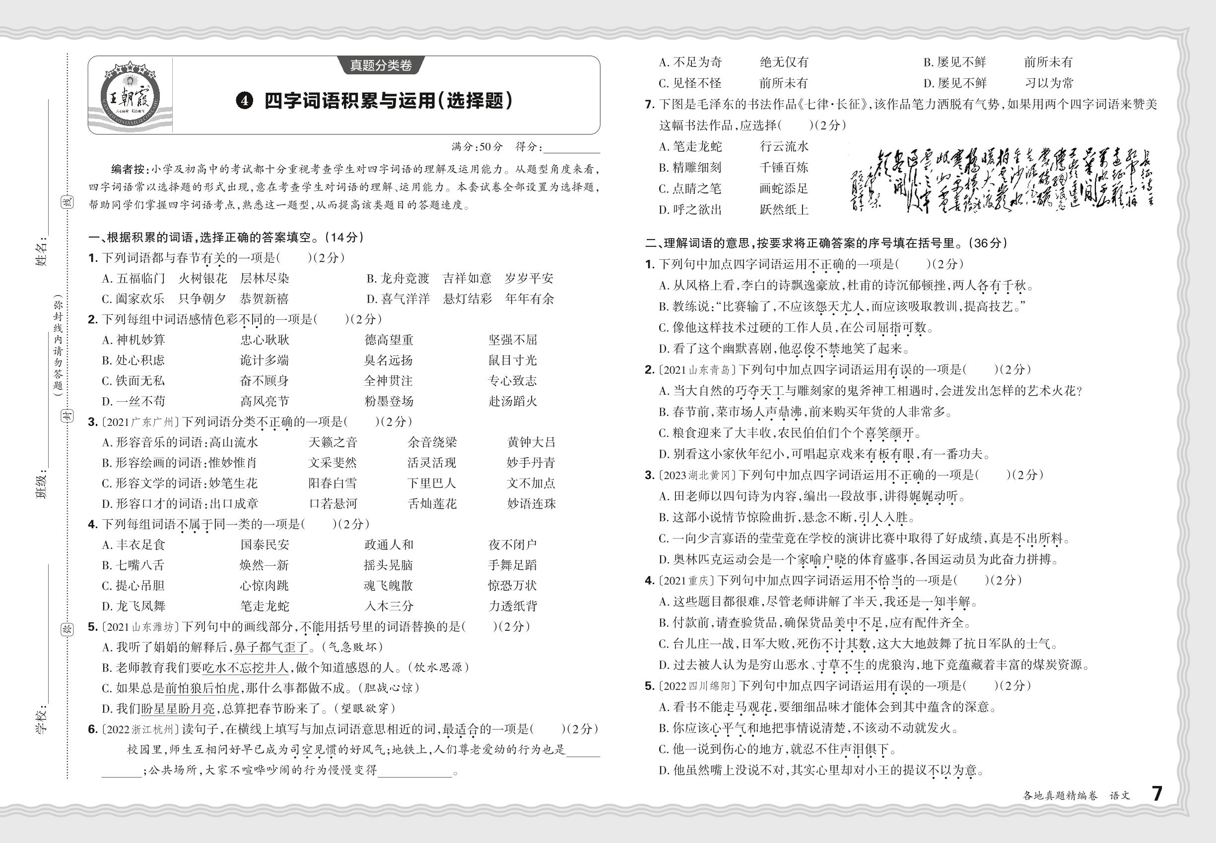 小升初语文·2024年真题分类卷——四字词语积累与运用(选择题)【4】