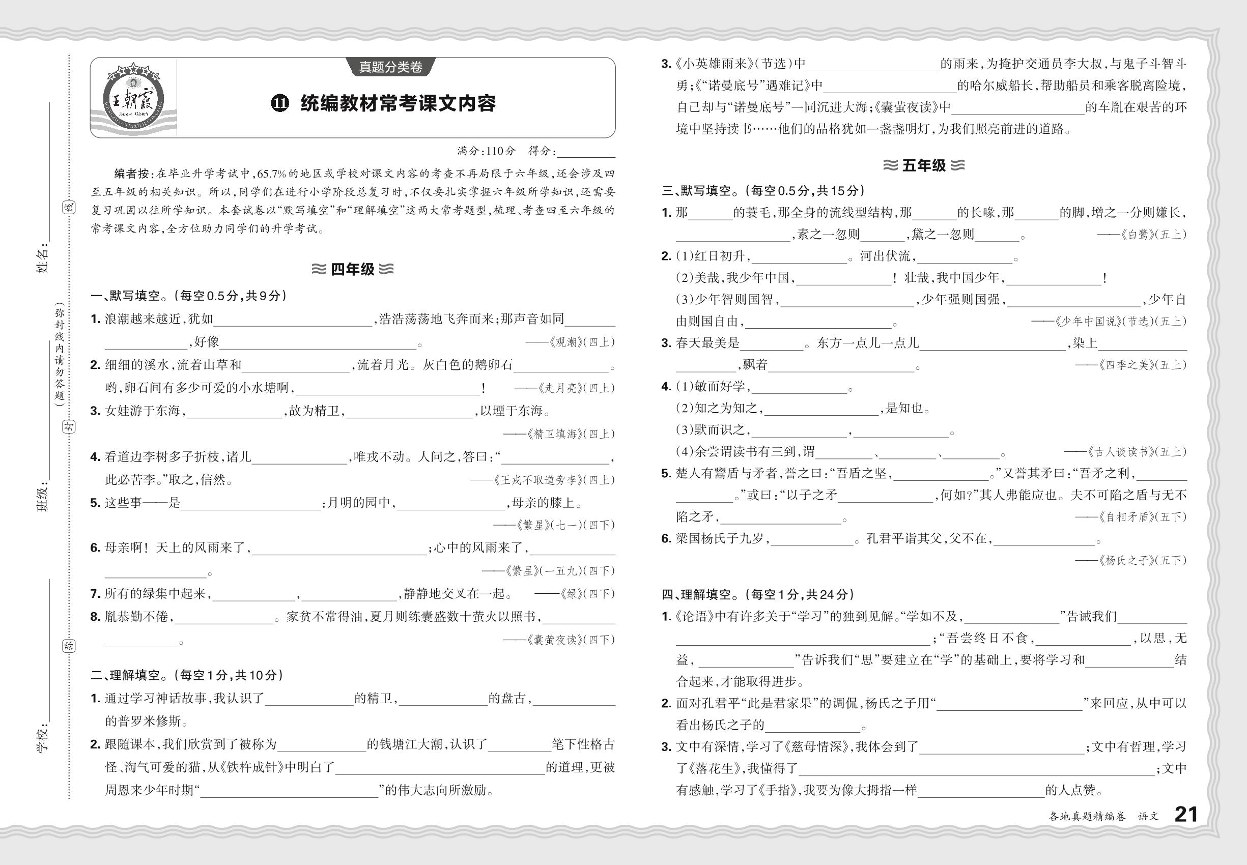 小升初语文·2024年真题分类卷——统编教材常考课文内容【11】