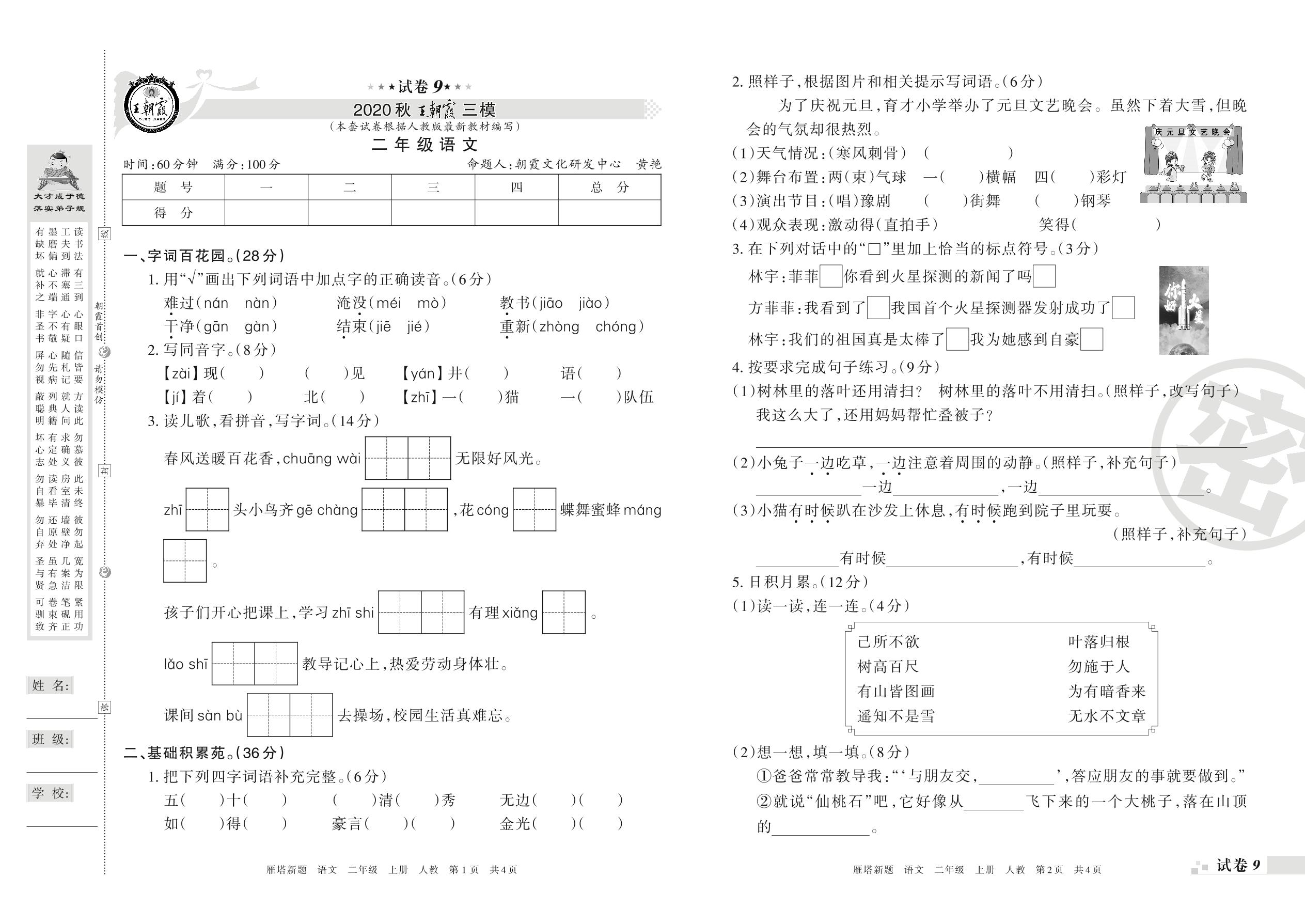 王朝霞期末模拟卷二年级上册语文(人教版)_R21080164124【9】