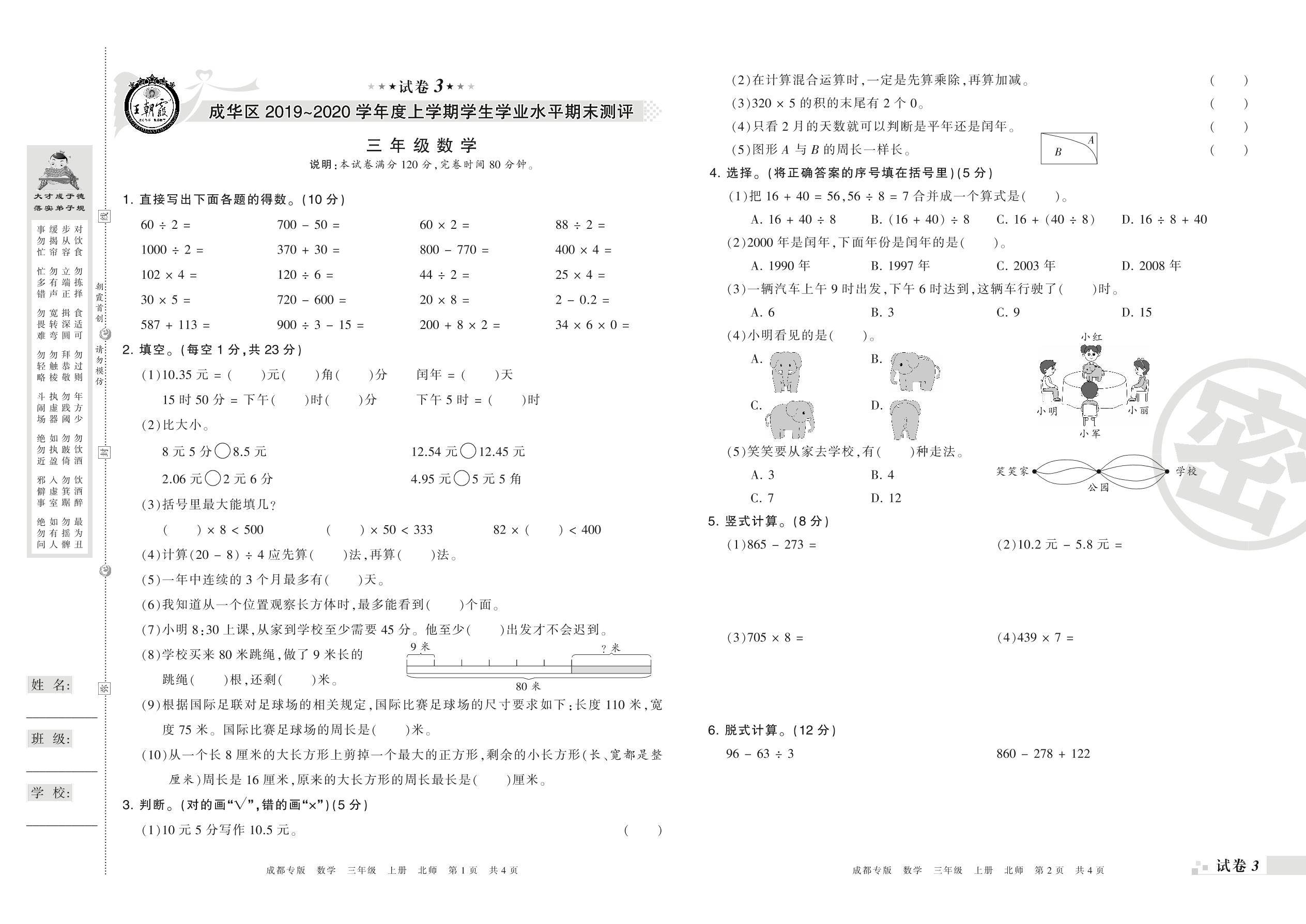 2019-2020学年第一学期成都市成华区三年级数学试卷(北师版)【3】