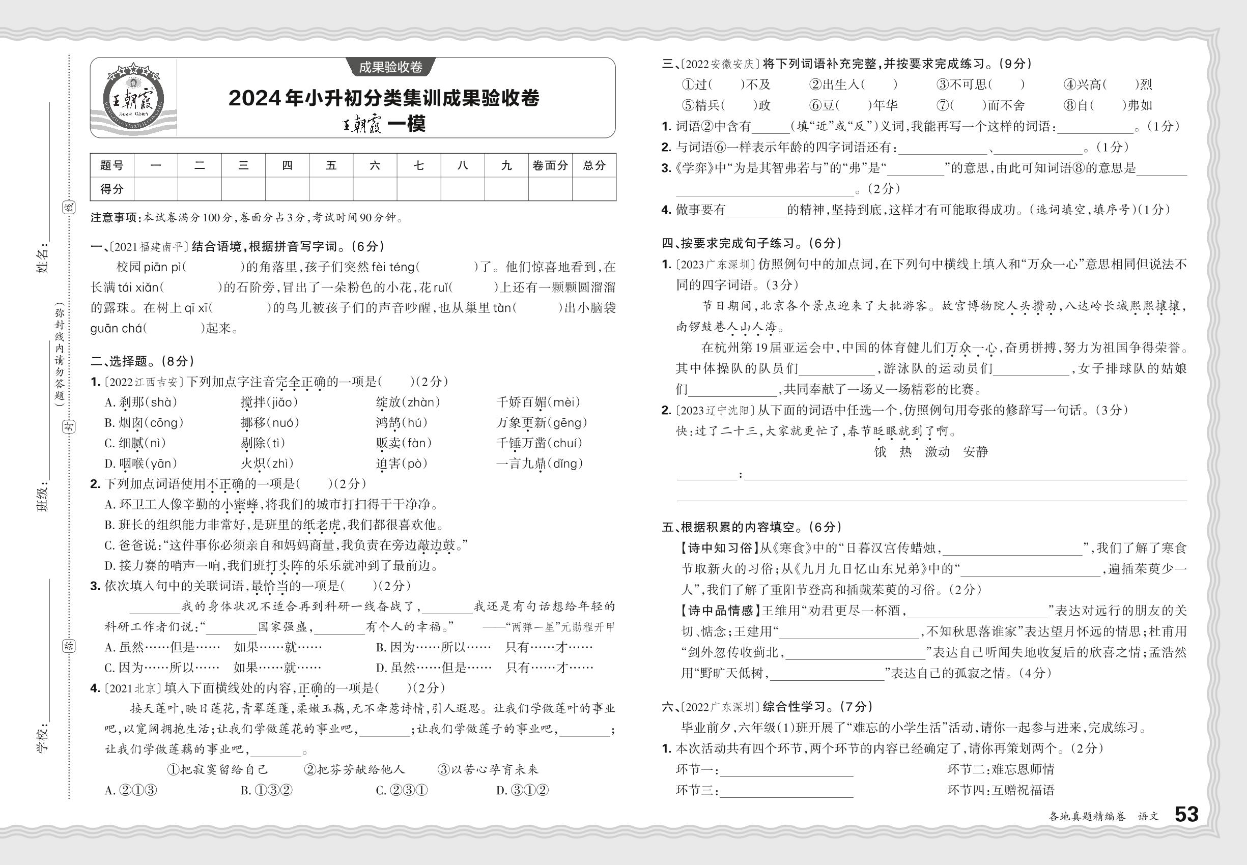 2024年小升初语文分类集训成果验收卷·王朝霞一模