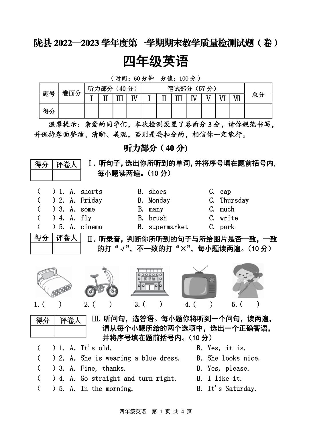 陕西省宝鸡市陇县2022-2023学年度第一学期期末教学质量检测试题卷四年级英语(冀教版)【无听力音频】