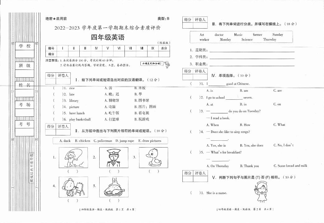 陕西省延安市富县2022-2023学年度第一学期期末综合素素质评价四年级英语(陕旅版)【无听力音频】