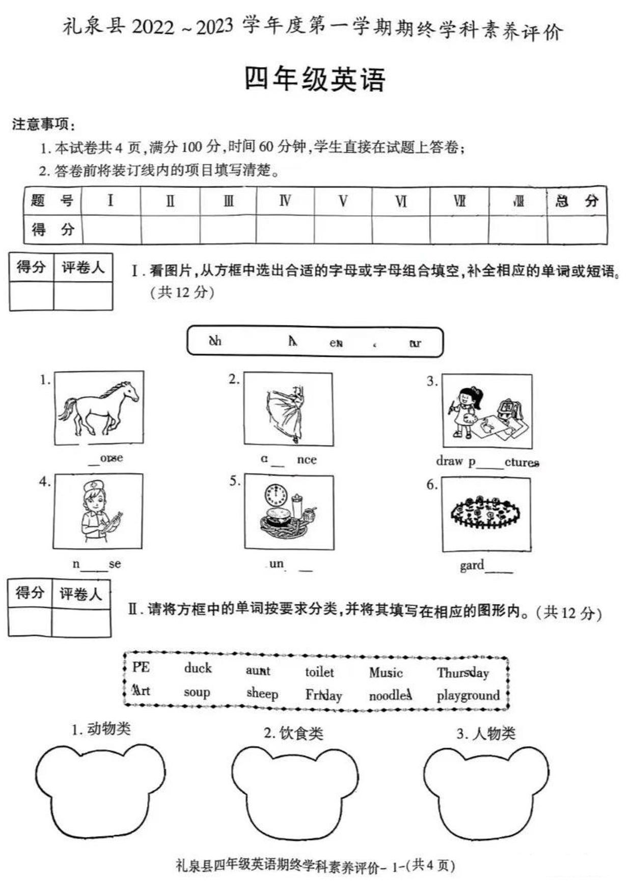 陕西省咸阳市礼泉县2022-2023学年度第一学期期终学科素养评价四年级英语(陕旅版)【无听力音频】