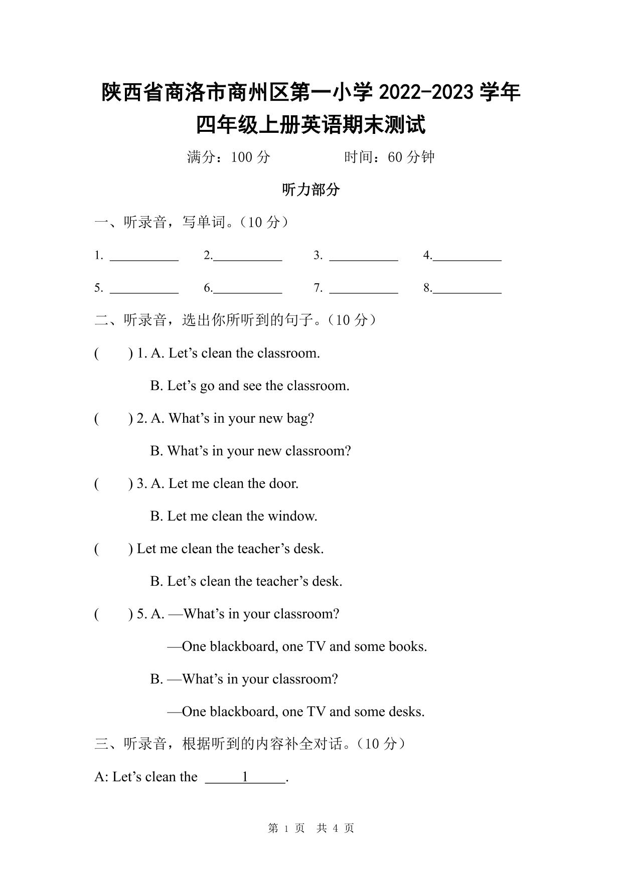 陕西省商洛市商州区第一小学2022-2023学年度第一学期期末测试四年级英语(陕旅版)【无听力音频】