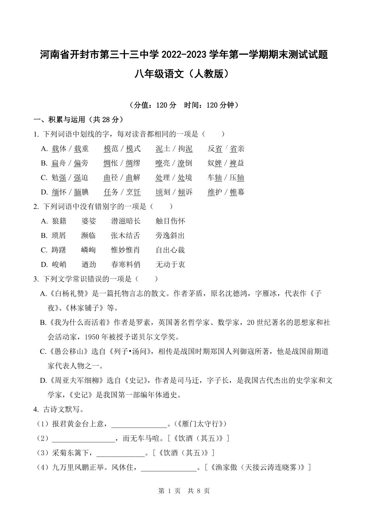 河南省开封市第三十三中学2022-2023学年第一学期期末测试试题八年级语文(人教版)