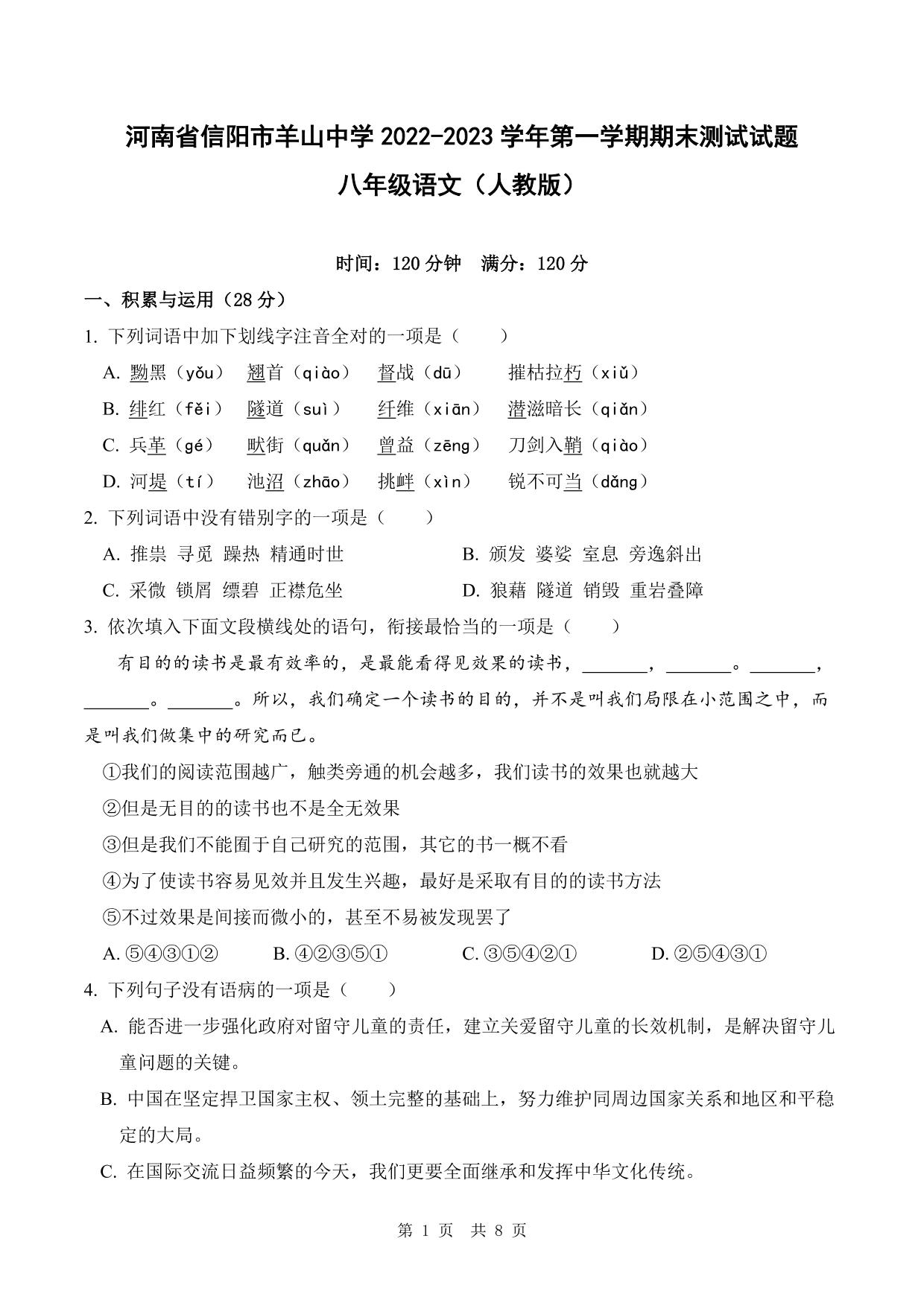 河南省信阳市羊山中学2022-2023学年第一学期期末测试试题八年级语文(人教版)