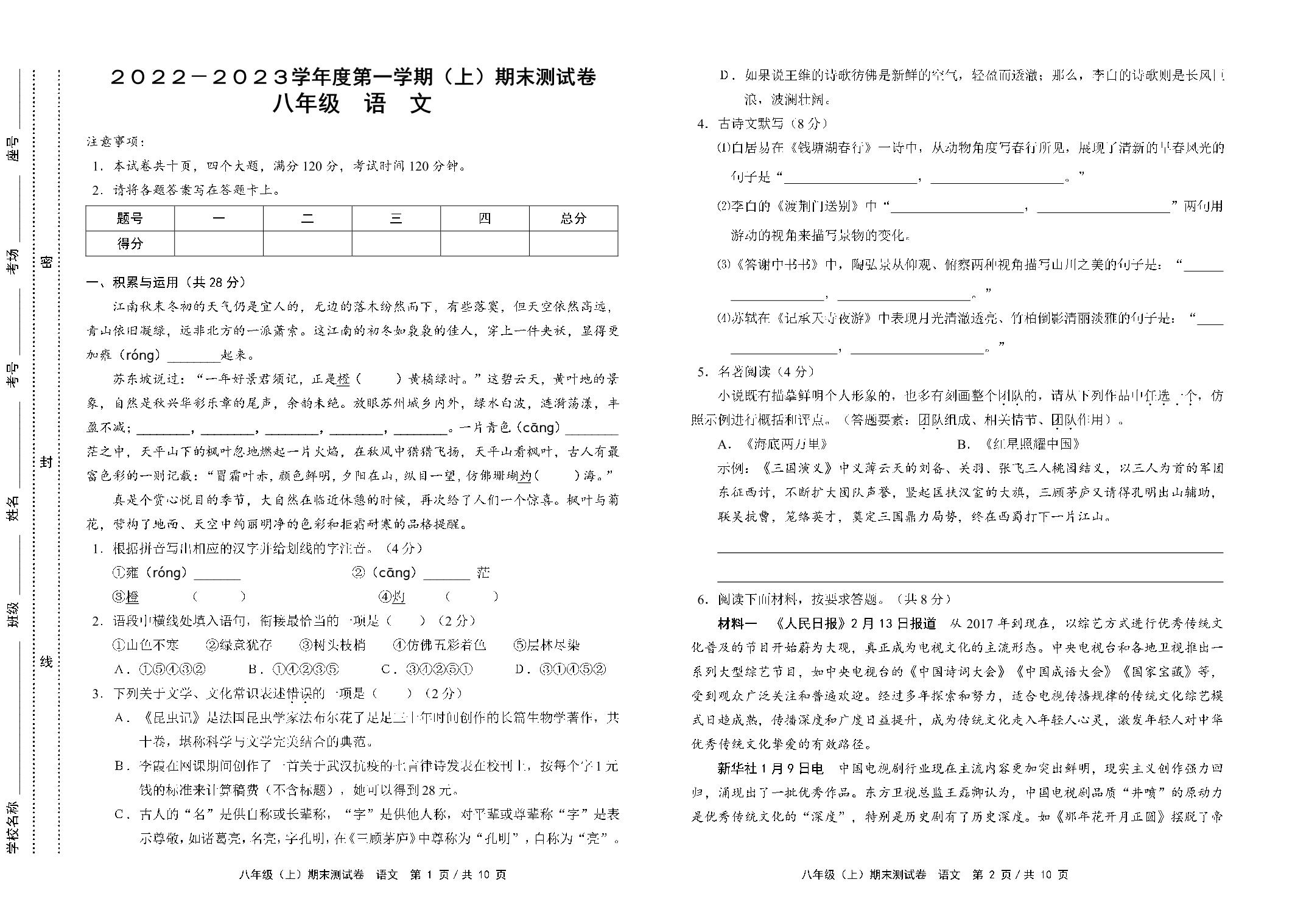河南省永城市2022-2023学年度第一学期(上)期末测试卷八年级语文(人教版)
