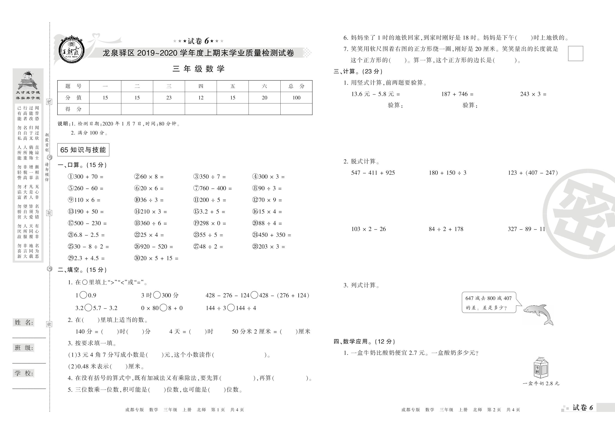 2019-2020学年第一学期成都市天府新区三年级数学试卷(北师版)【6】