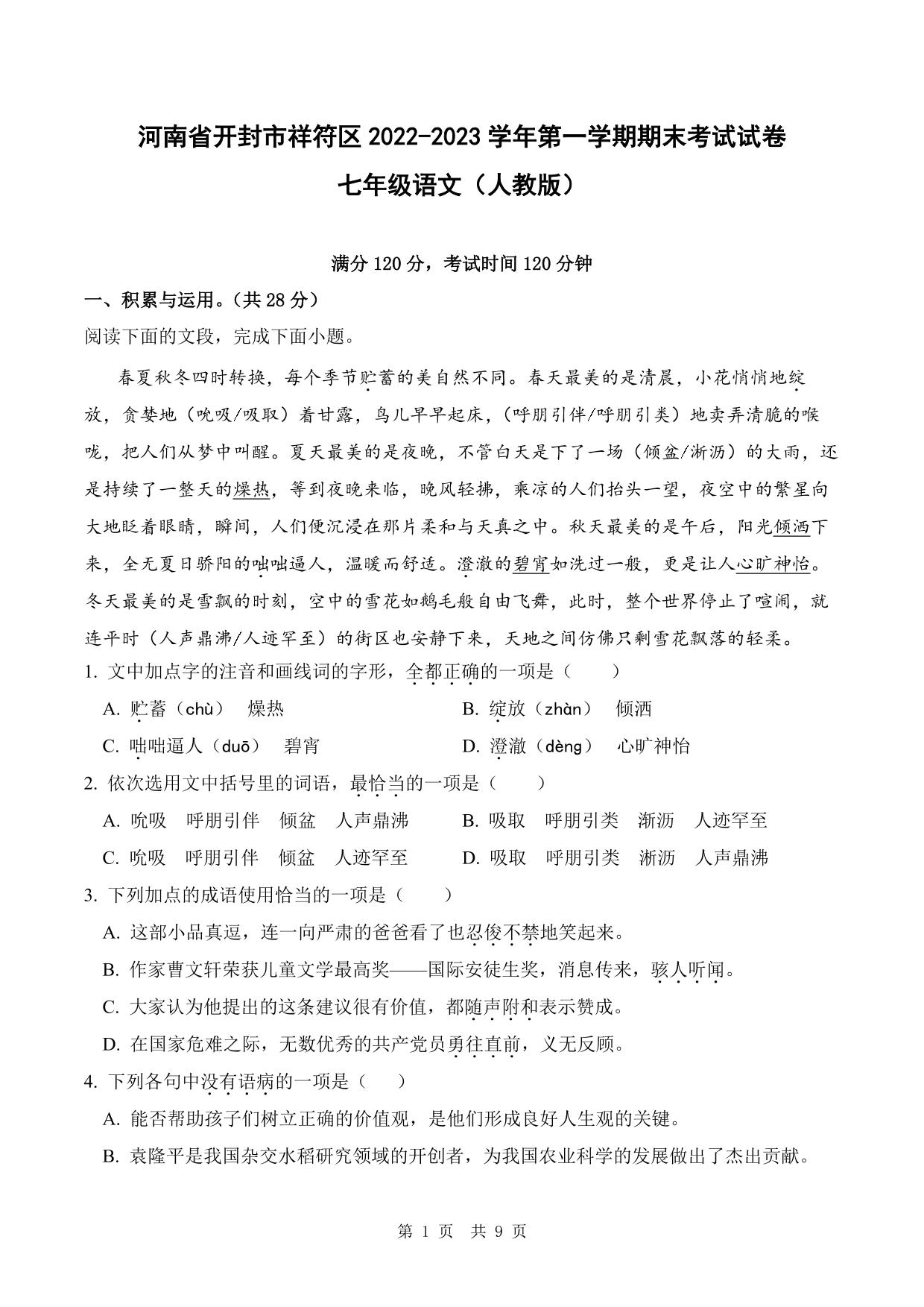 河南省开封市祥符区2022-2023学年第一学期期末考试试卷七年级语文(人教版)