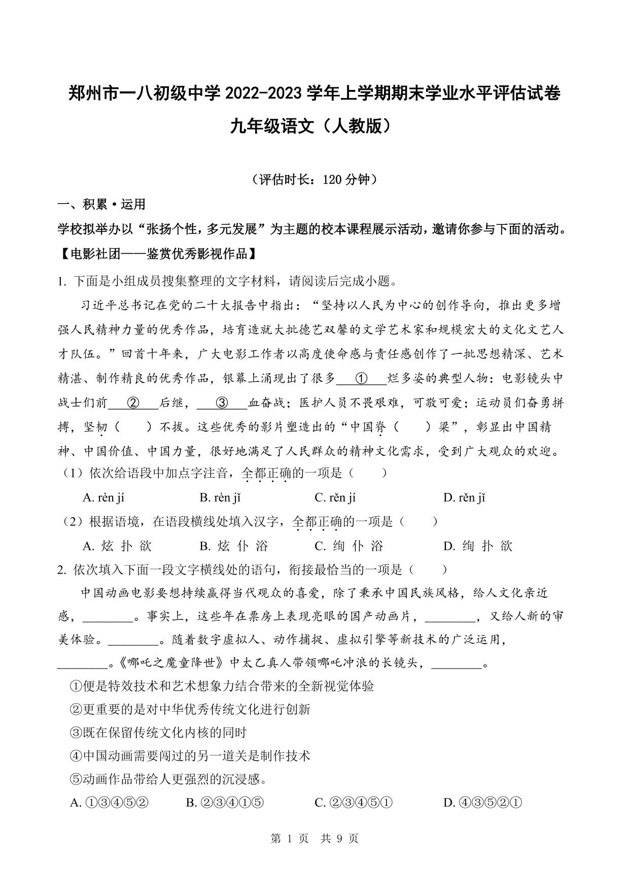 河南省郑州市金水区一八初级中学2022-2023学年上学期期末学业水平评估试卷九年级语文(人教版)