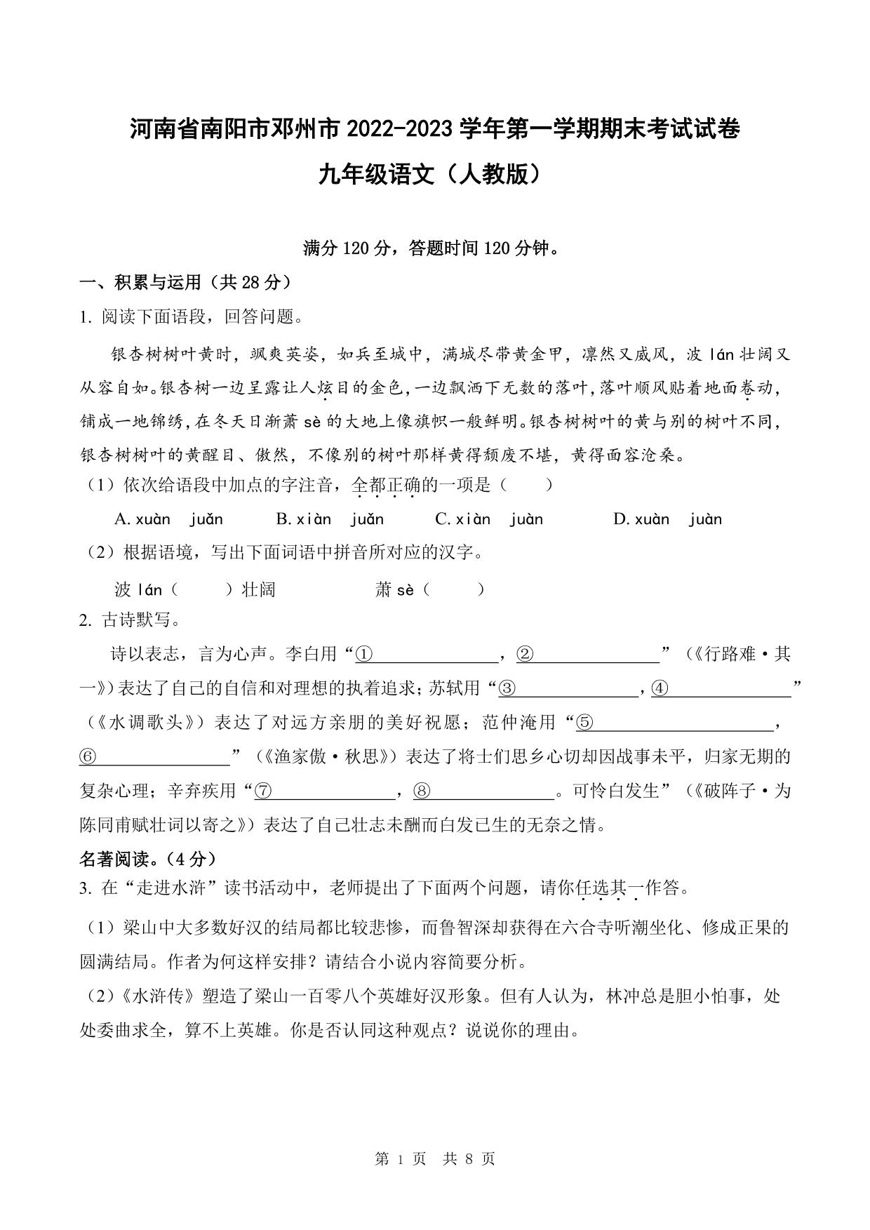 河南省南阳市邓州市2022-2023学年第一学期期末考试试卷九年级语文(人教版)
