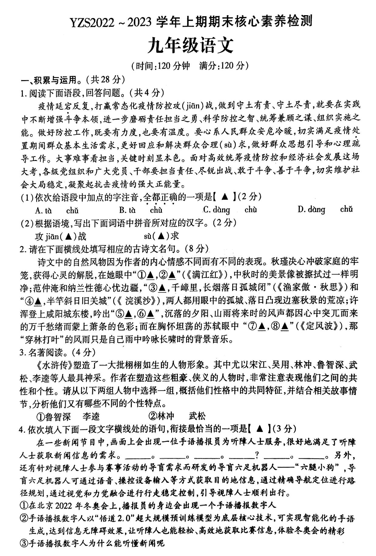 河南省许昌市禹州市2022-2023学年上学期期末核心素养检测九年级语文(人教版)
