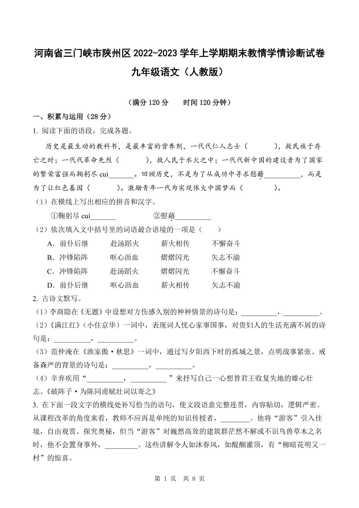 河南省三门峡市陕州区2022-2023学年上学期期末教情学情诊断试卷九年级语文(人教版)