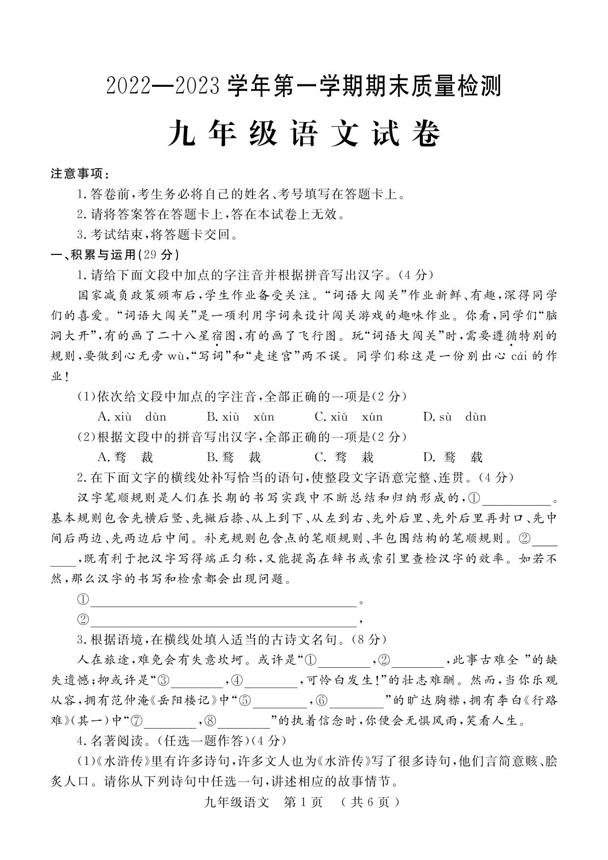 河南省洛阳市宜阳县2022-2023学年第一学期期末质量检测试卷九年级语文(人教版)