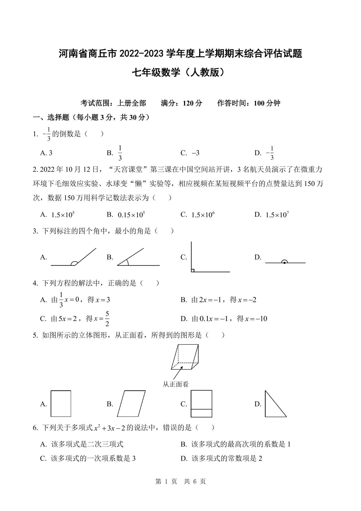 河南省商丘市2022-2023学年度上学期期末综合评估试题七年级数学(人教版)