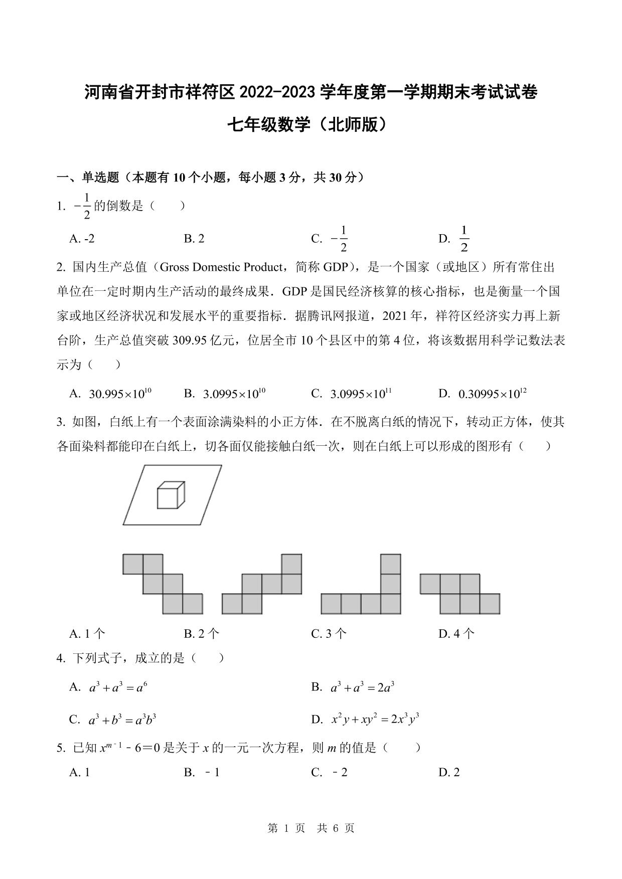 河南省开封市祥符区2022-2023学年度第一学期期末考试试卷七年级数学(北师版)