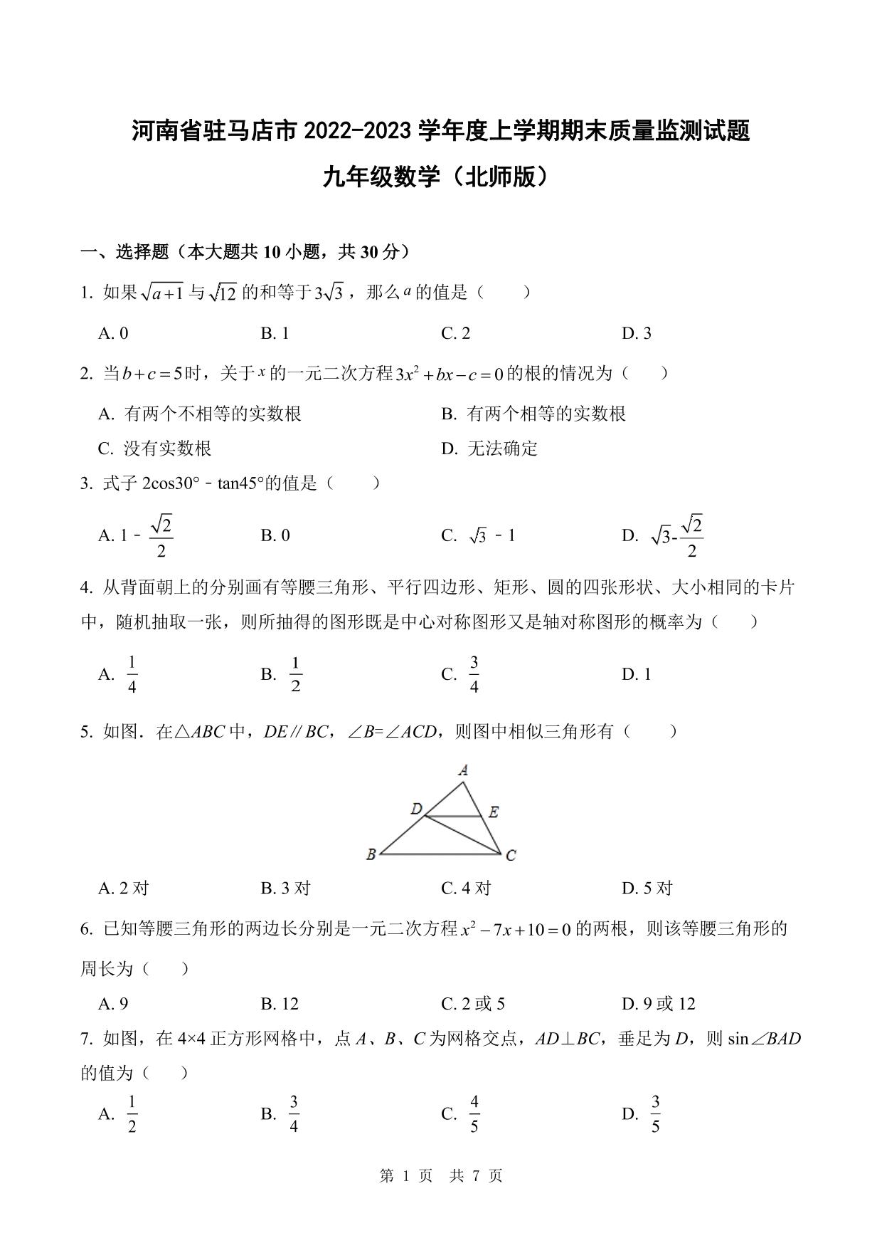 河南省驻马店市2022-2023学年度上学期期末质量监测试题九年级数学(北师版)
