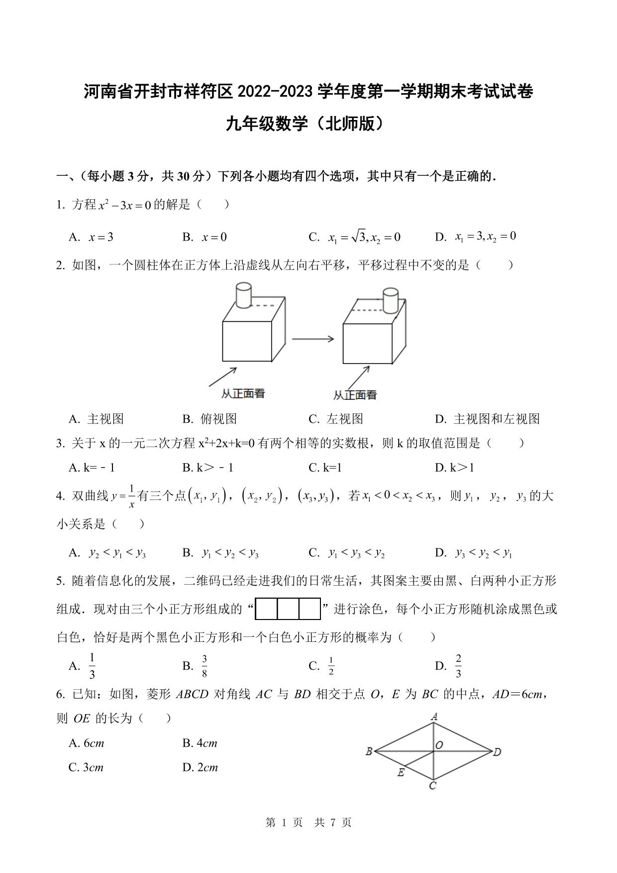 河南省开封市祥符区2022-2023学年度第一学期期末考试试卷九年级数学(北师版)
