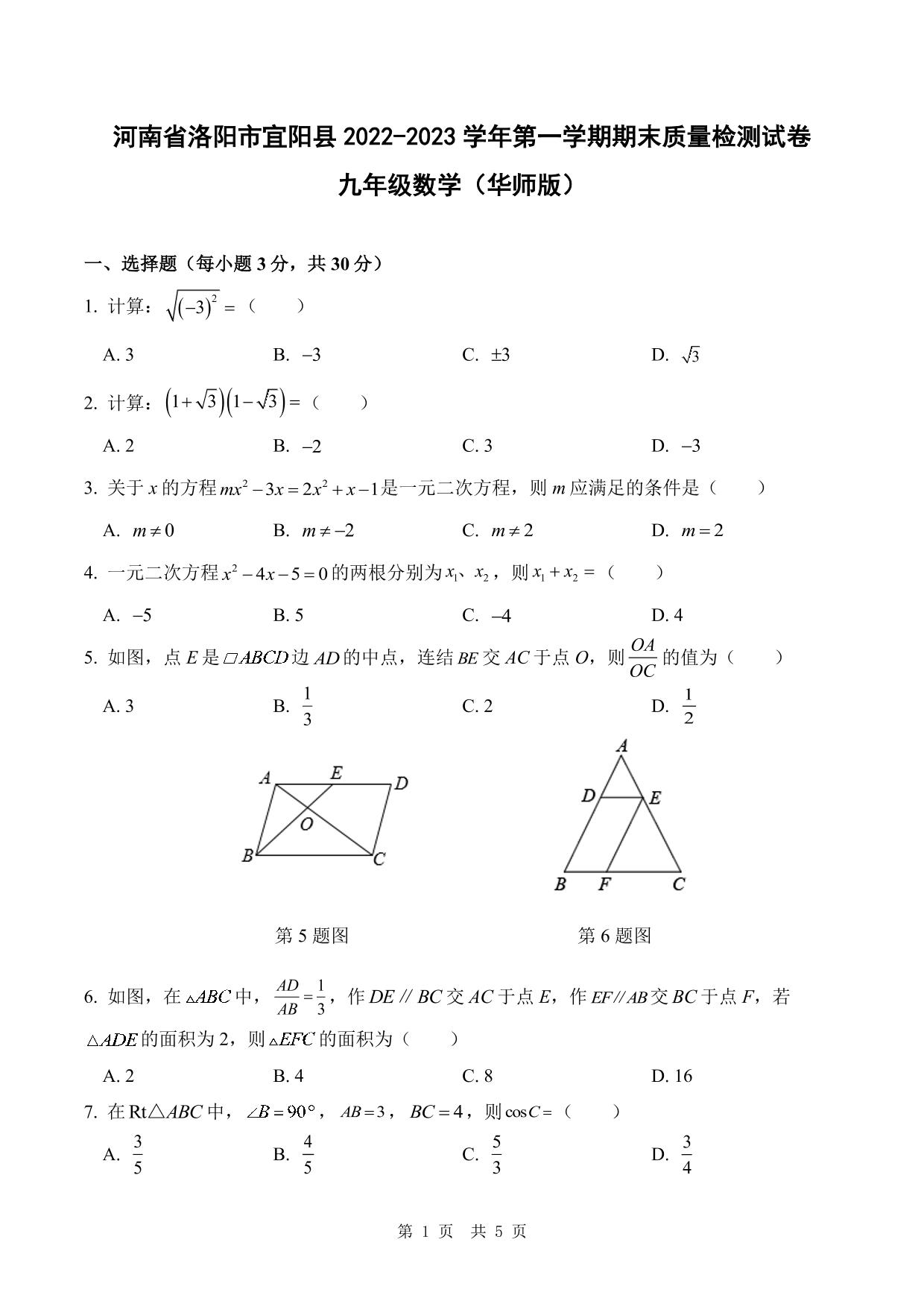 河南省洛阳市宜阳县2022-2023学年第一学期期末质量检测试卷九年级数学(华师版)
