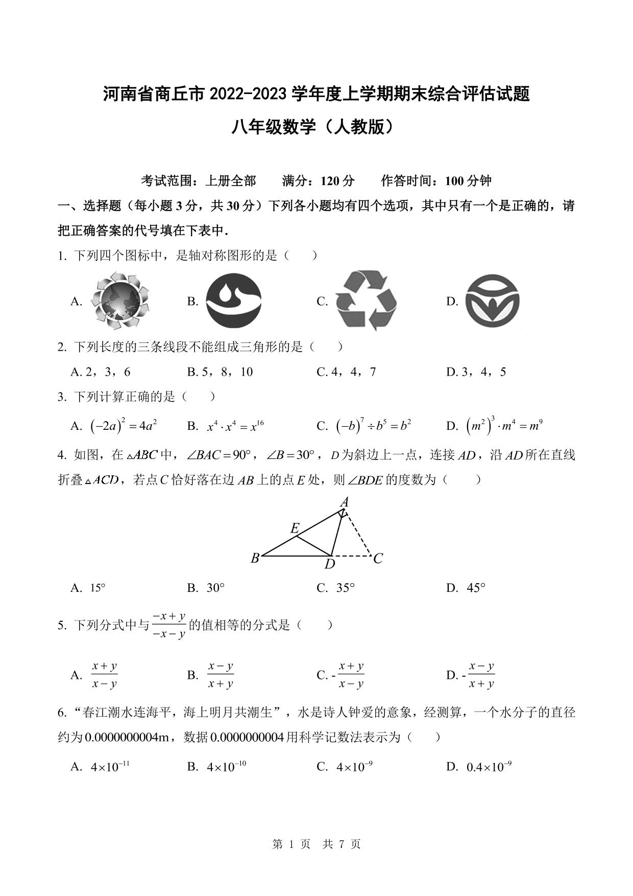 河南省商丘市2022-2023学年度上学期期末综合评估试题八年级数学(人教版)