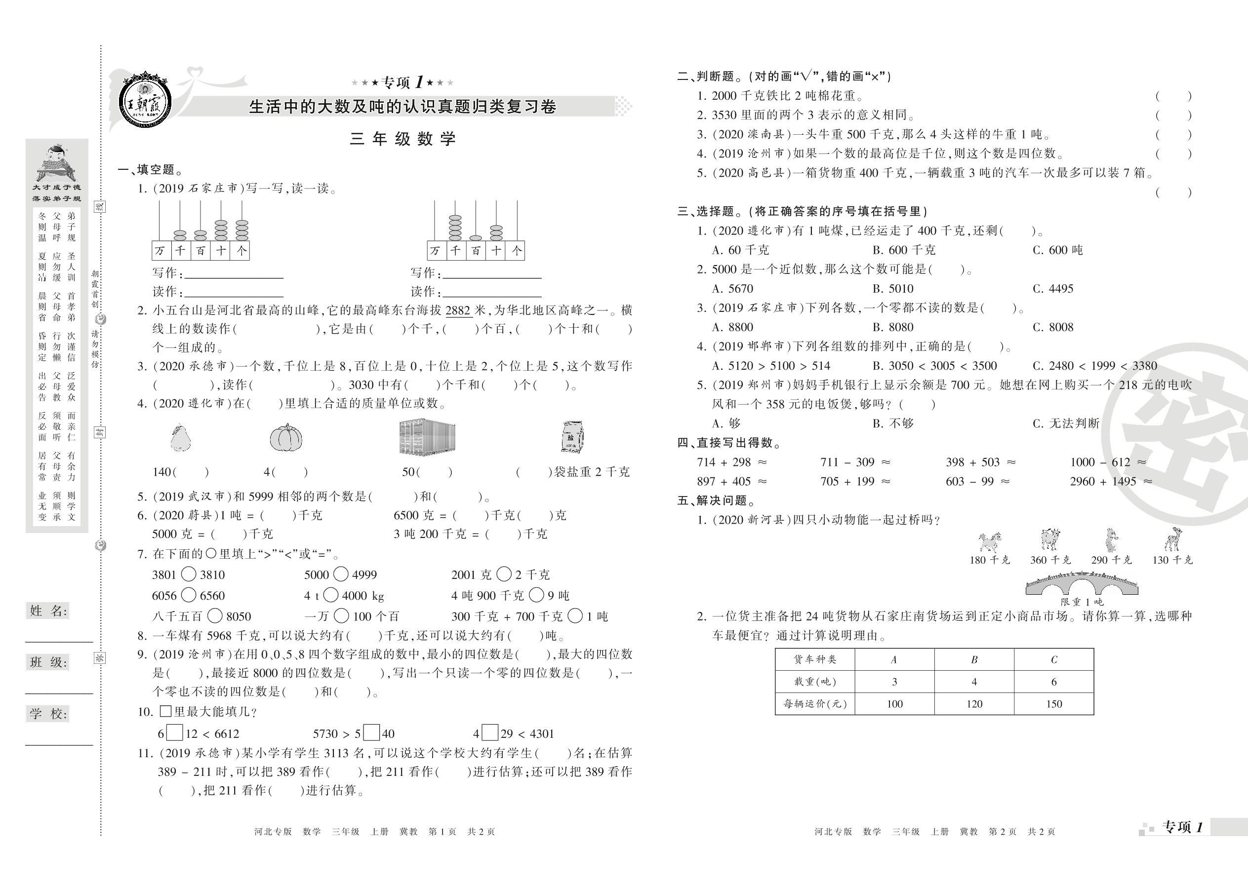 王朝霞期末专项卷——生活中的大数及吨的认识、两三位数乘一位数三年级上册数学(冀教版)【0】