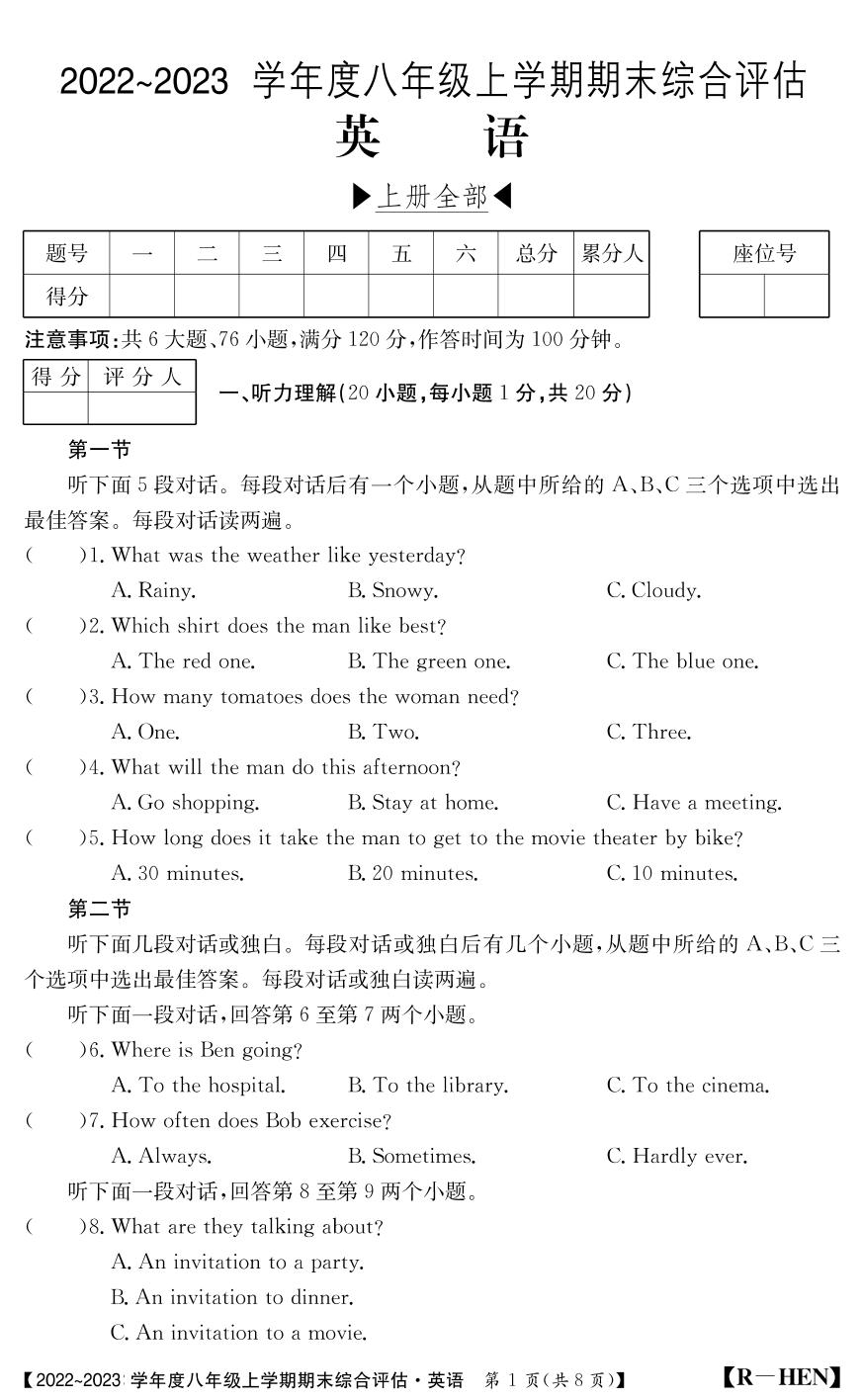 河南省周口市淮阳区红旗中学2022-2023学年度上学期期末综合评估八年级英语(人教版)【无听力音频】