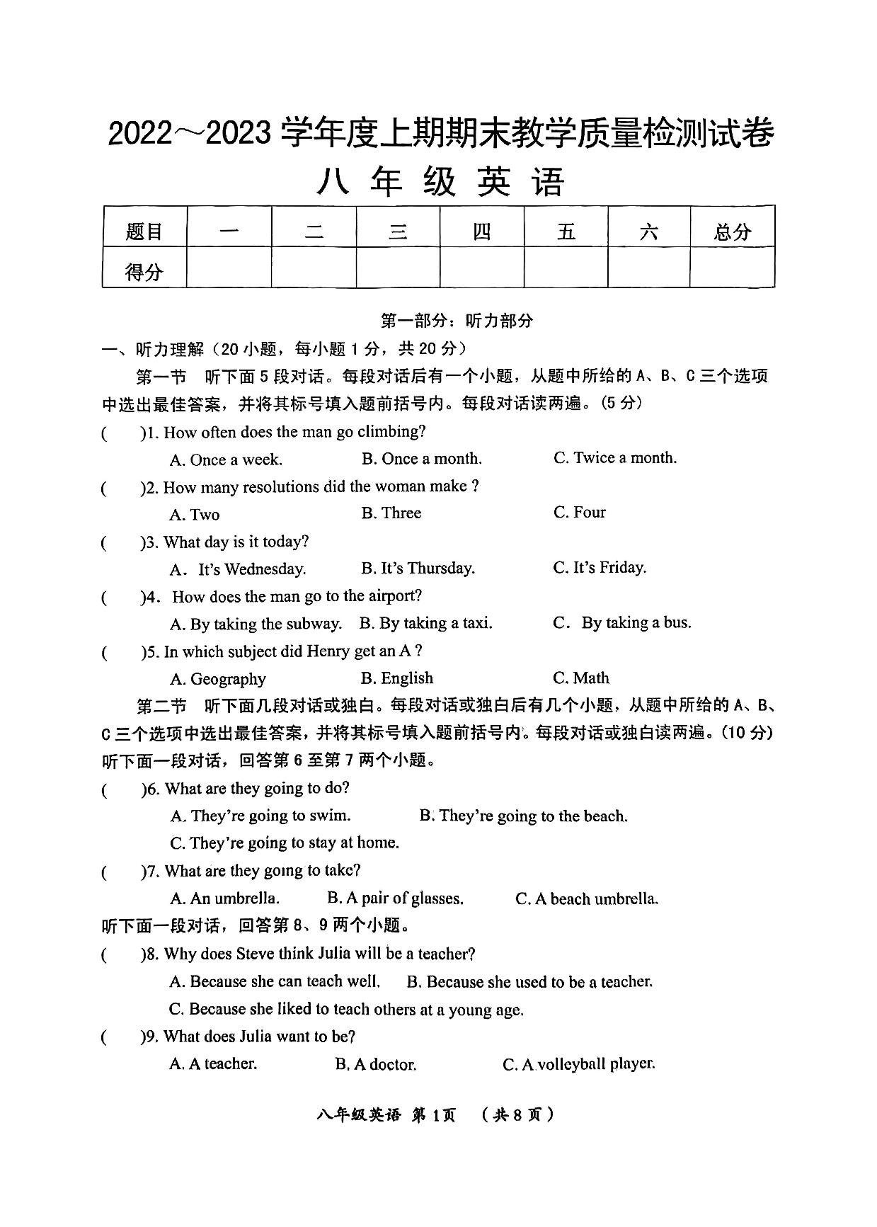 河南省漯河市郾城区2022-2023学年度上学期期末教学质量检测试卷八年级英语(新课标版)【无听力音频】