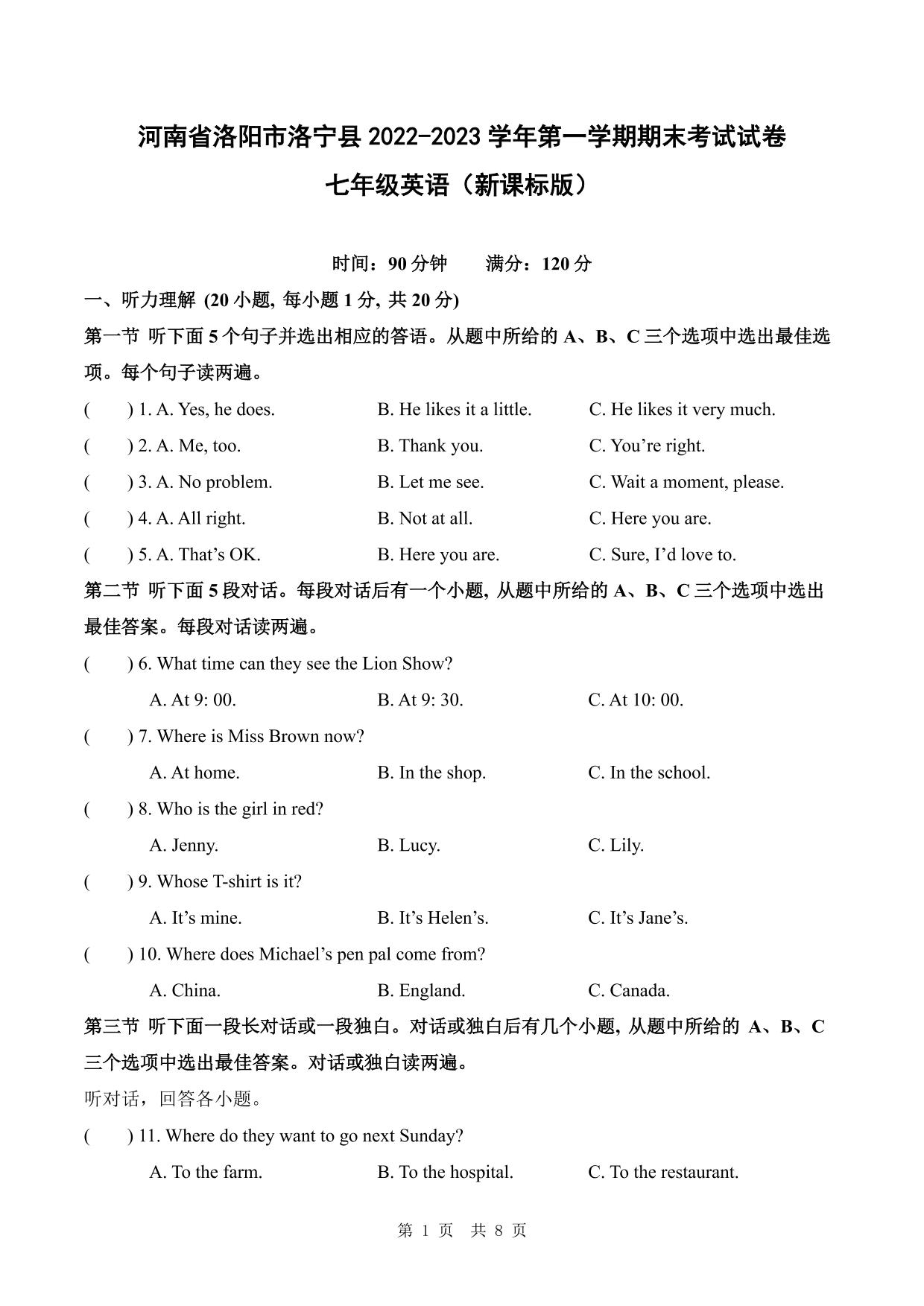 河南省洛阳市洛宁县2022-2023学年第一学期期末考试试卷七年级英语(新课标版)【无听力音频】