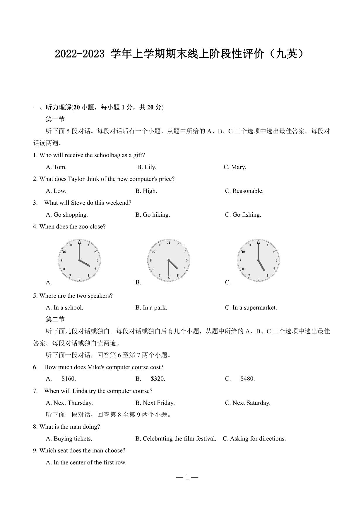 河南省郑州励德双语学校2022-2023学年上学期期末线上阶段性评价试题九年级英语(人教版)【无听力音频】