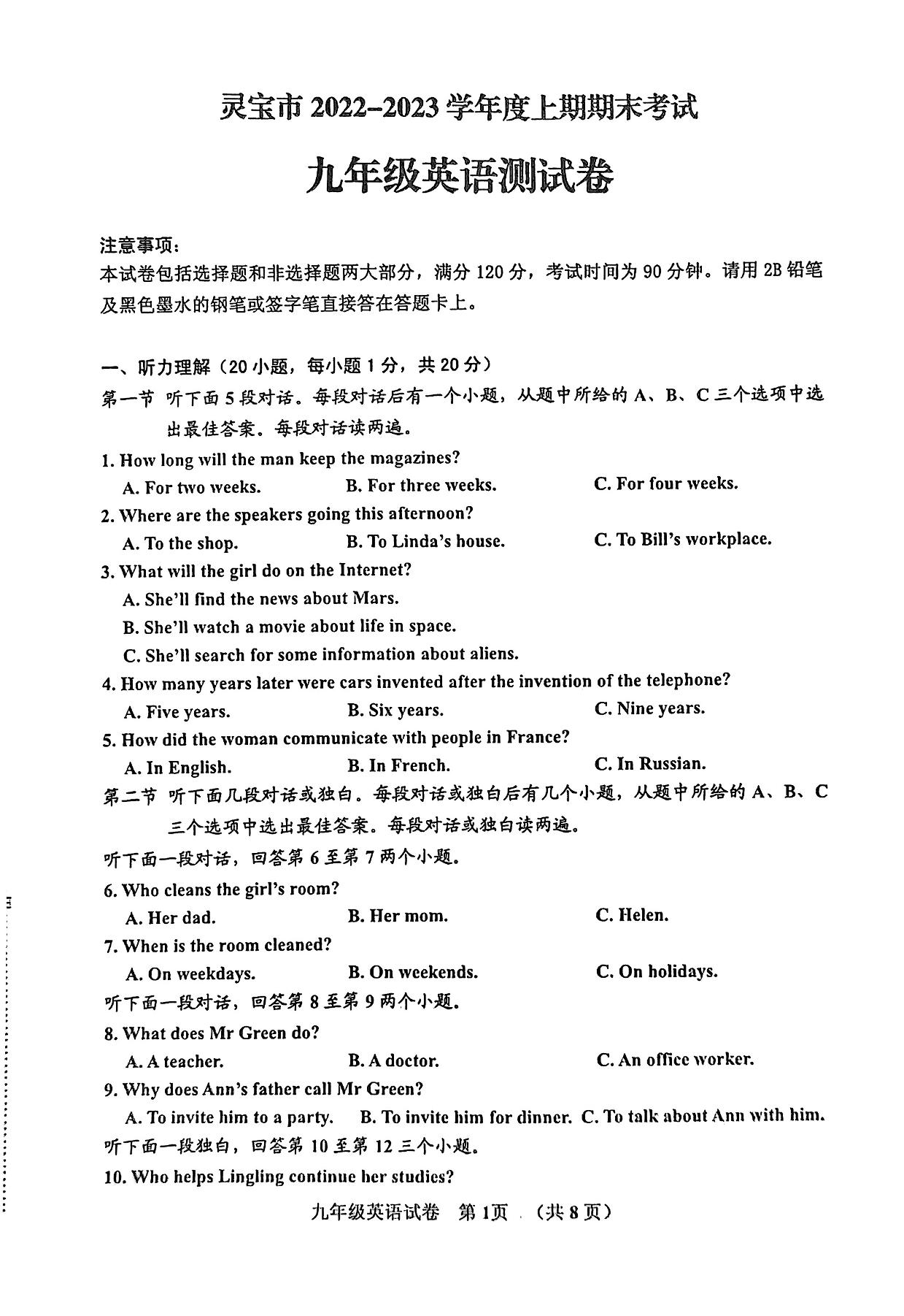 河南省三门峡市灵宝市2022-2023学年度上期期末考试测试卷九年级英语(新课标版)【无听力音频】