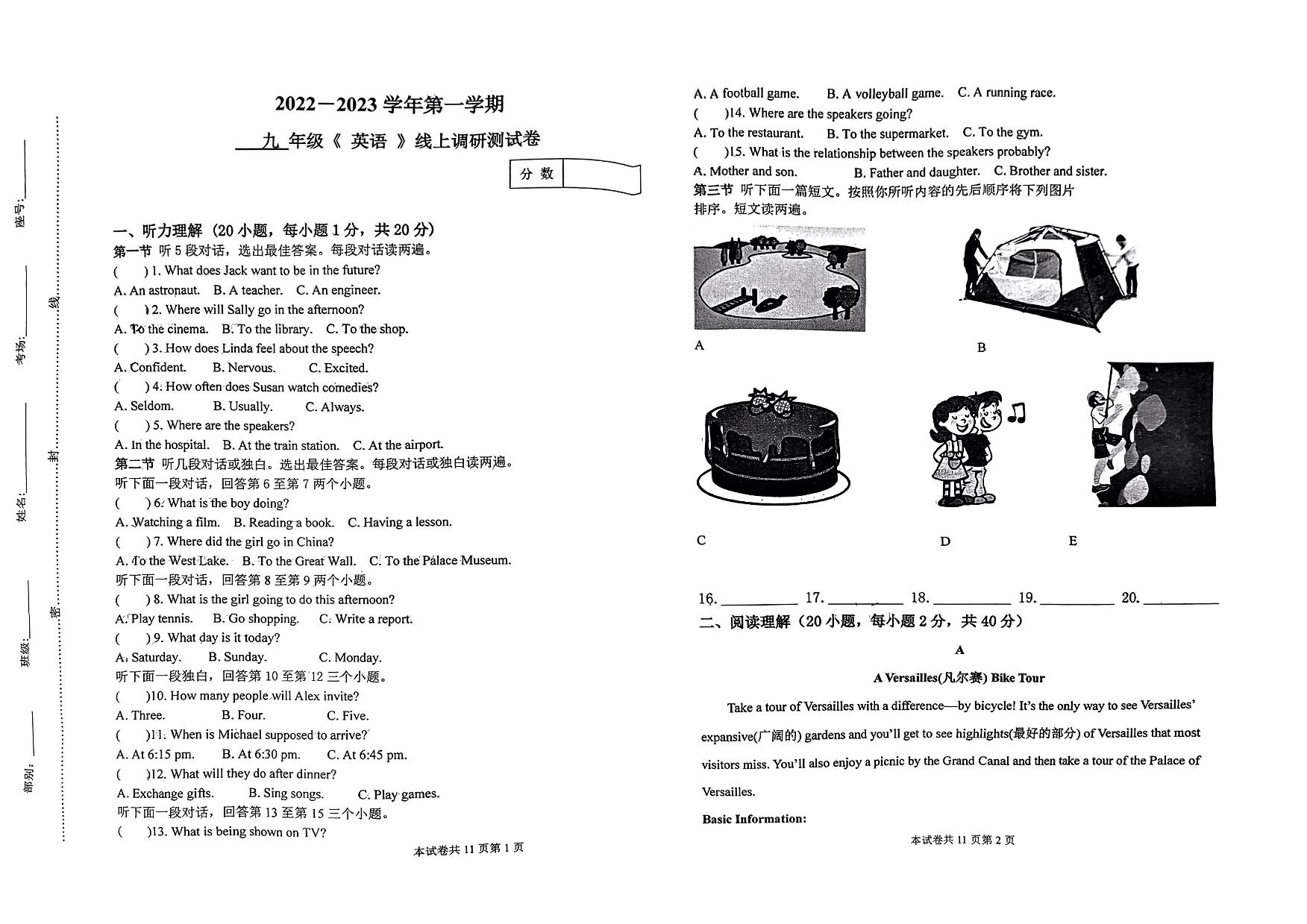 河南省新乡市河南师范大学附属中学2022-2023学年第一学期期末线上调研测试卷九年级英语(新课标版)【无听力音频】