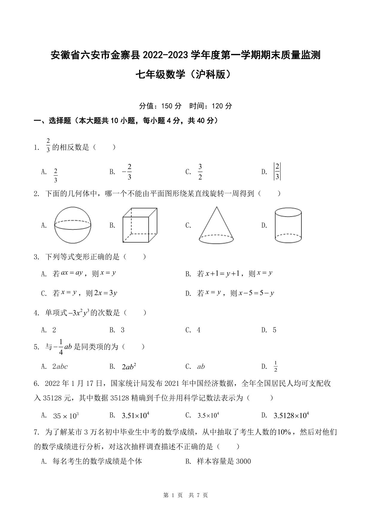 安徽省六安市金寨县2022-2023学年度第一学期期末质量监测七年级数学(沪科版)