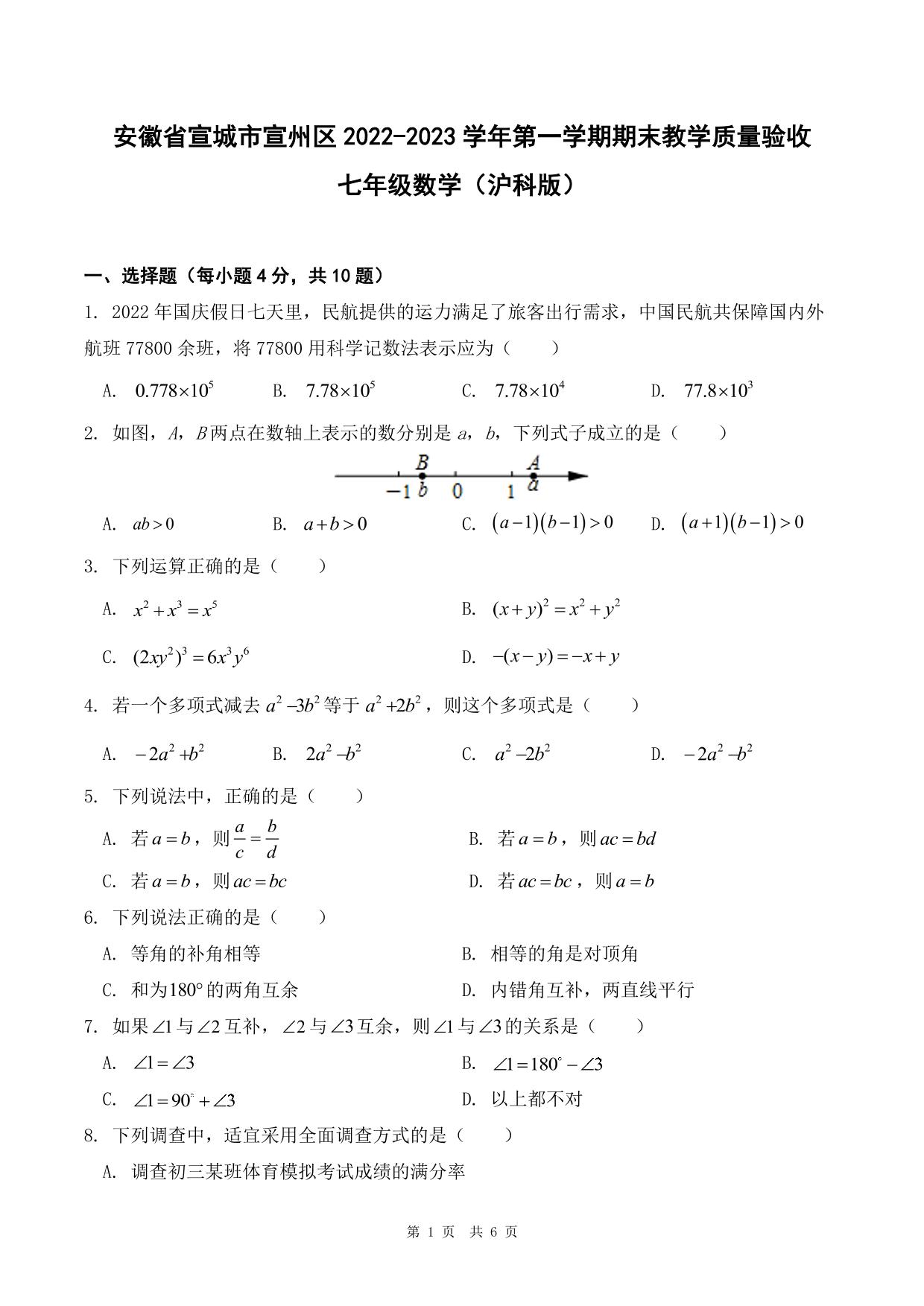 安徽省宣城市宣州区2022~2023学年度第一学期期末教学质量验收七年级数学(沪科版)