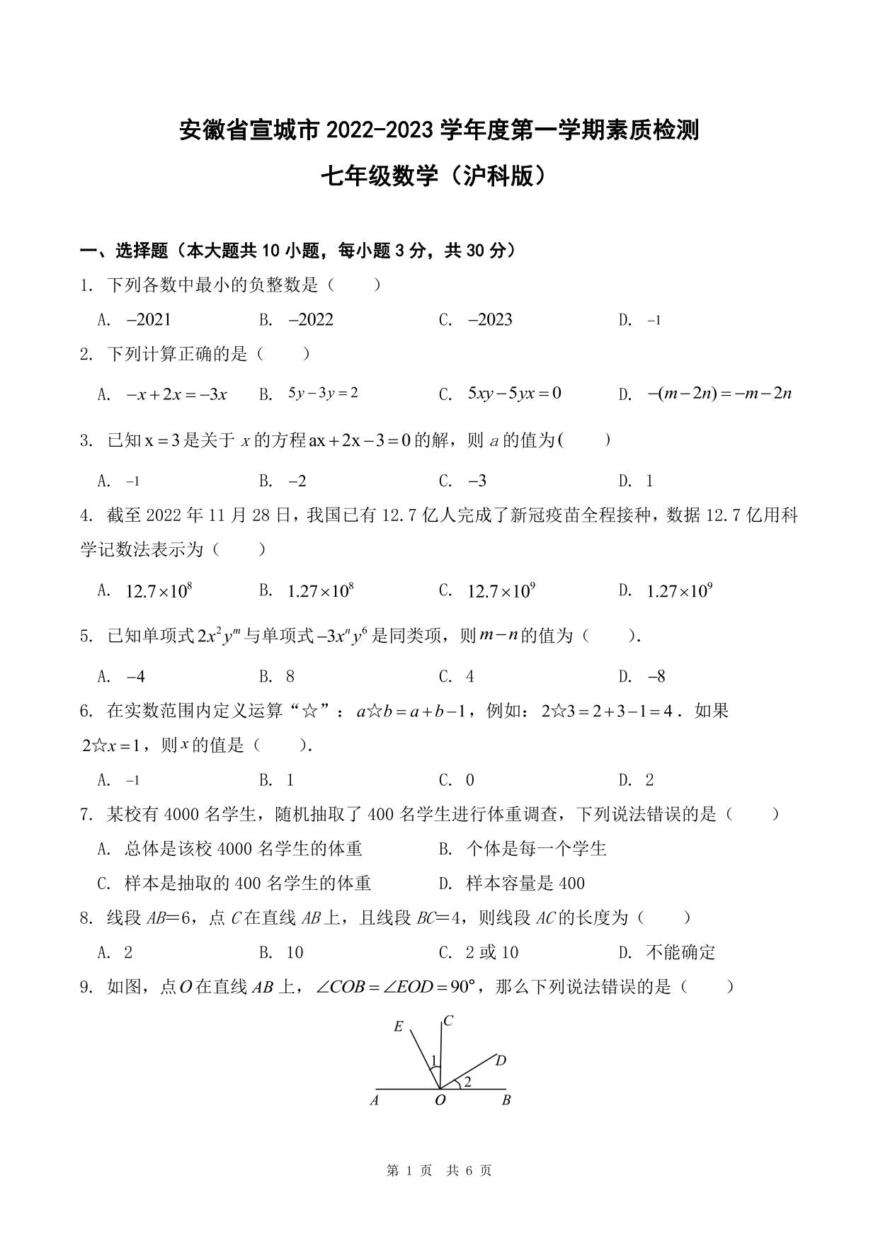 安徽省宣城市2022-2023学年度第一学期素质检测七年级数学(沪科版)