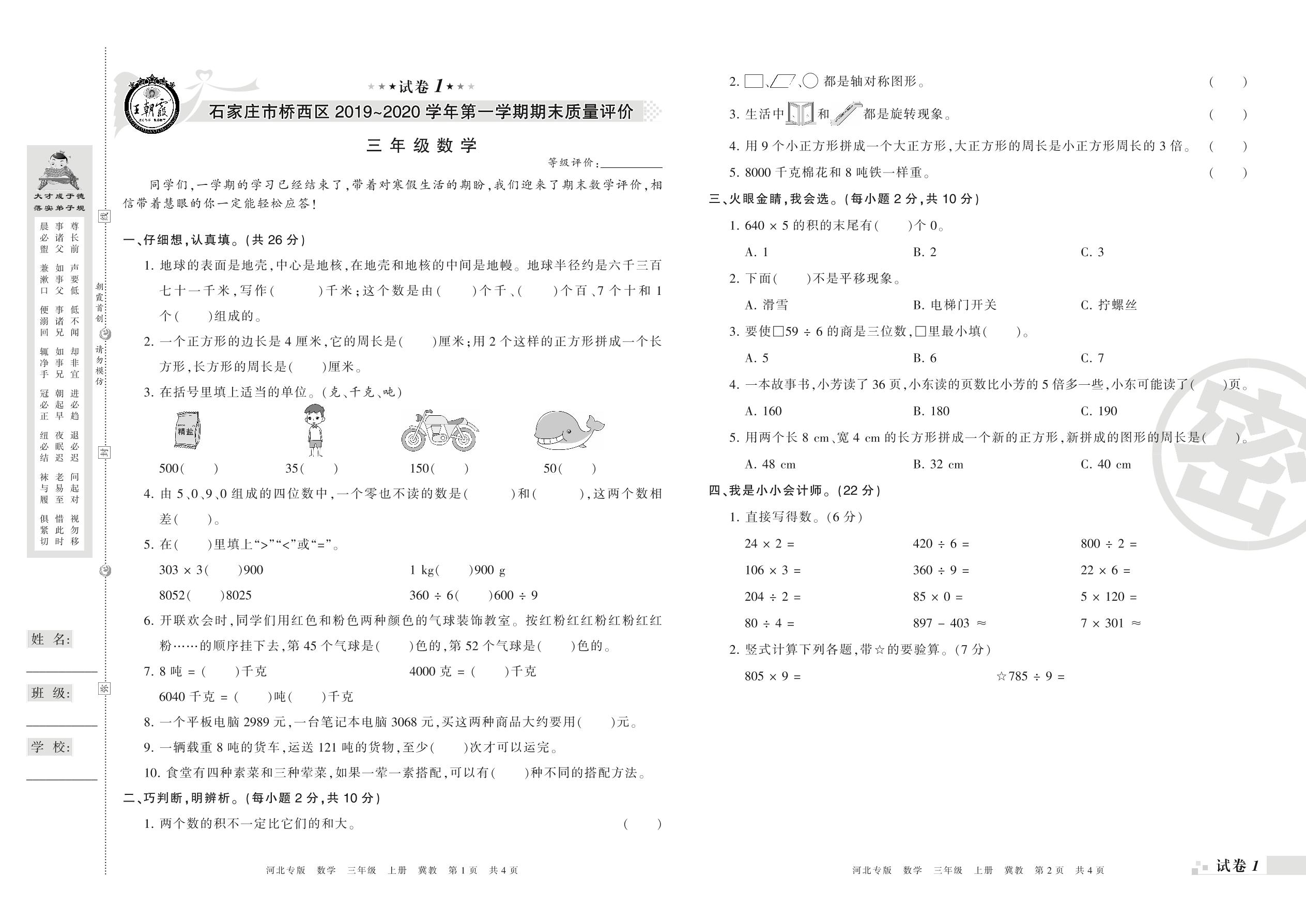 2019-2020学年第一学期石家庄市桥西区三年级数学试卷(冀教版)【1】