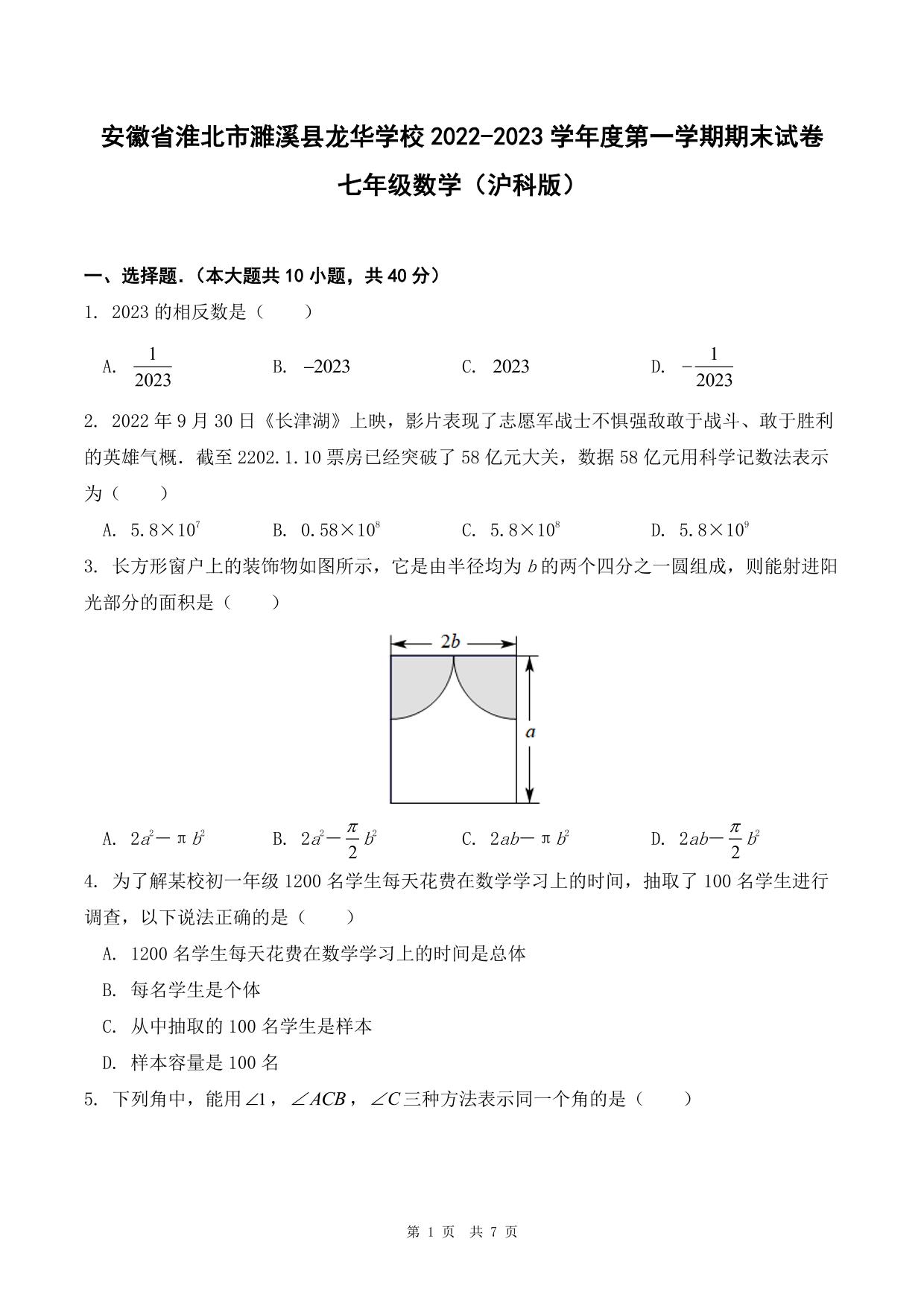 安徽省淮北市濉溪县龙华学校2022-2023学年度第一学期期末试卷七年级数学(沪科版)