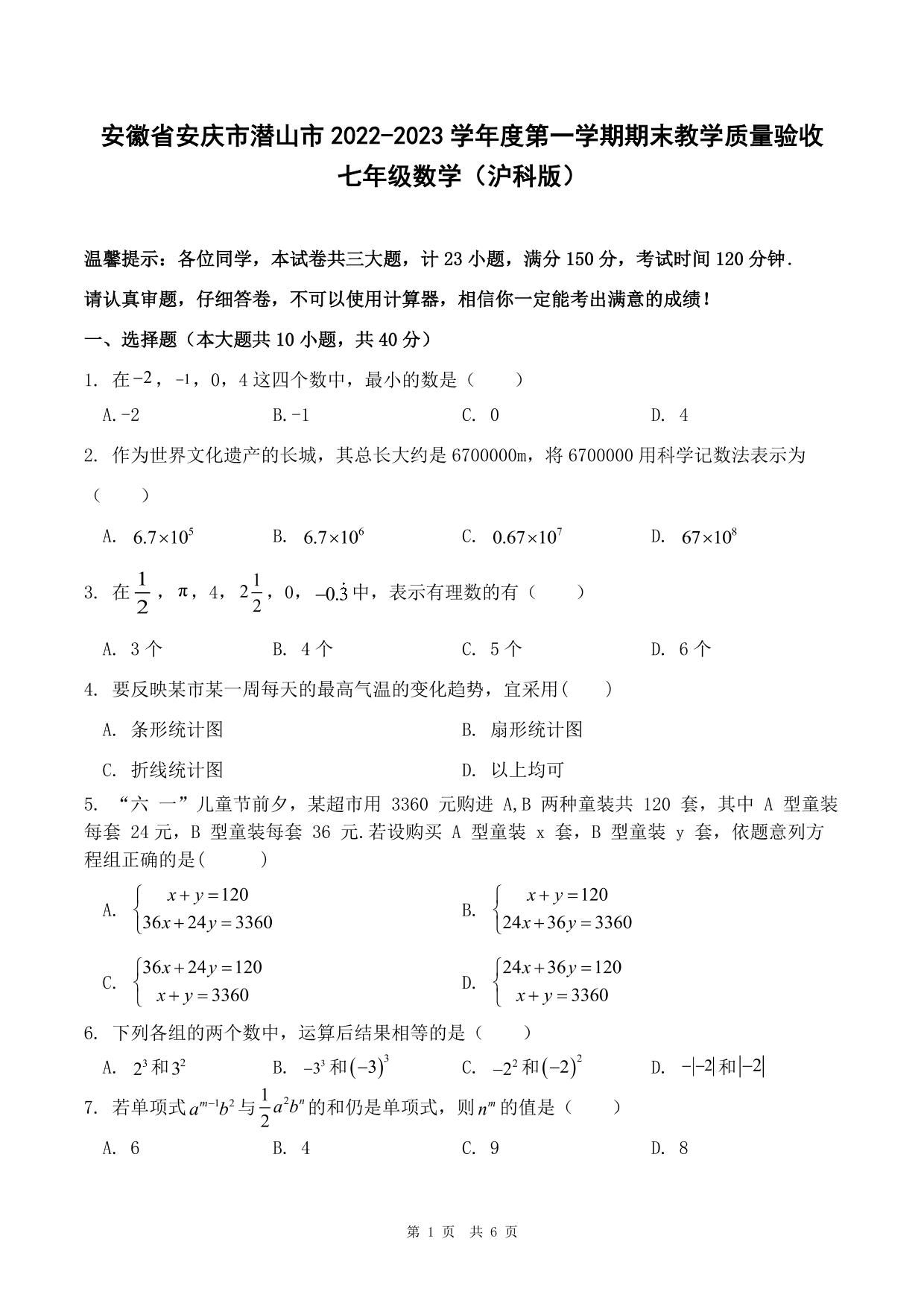 安徽省安庆市潜山市2022-2023学年度第一学期期末教学质量验收七年级数学(沪科版)