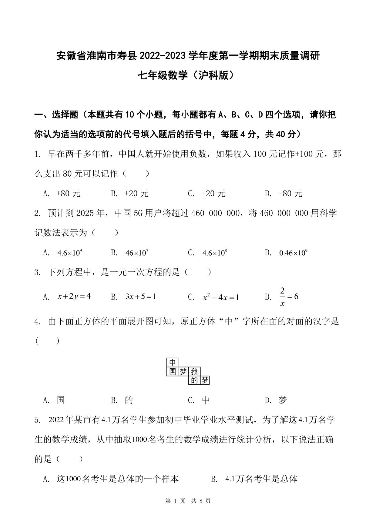安徽省淮南市寿县2022-2023学年度第一学期期末质量调研七年级数学(沪科版)
