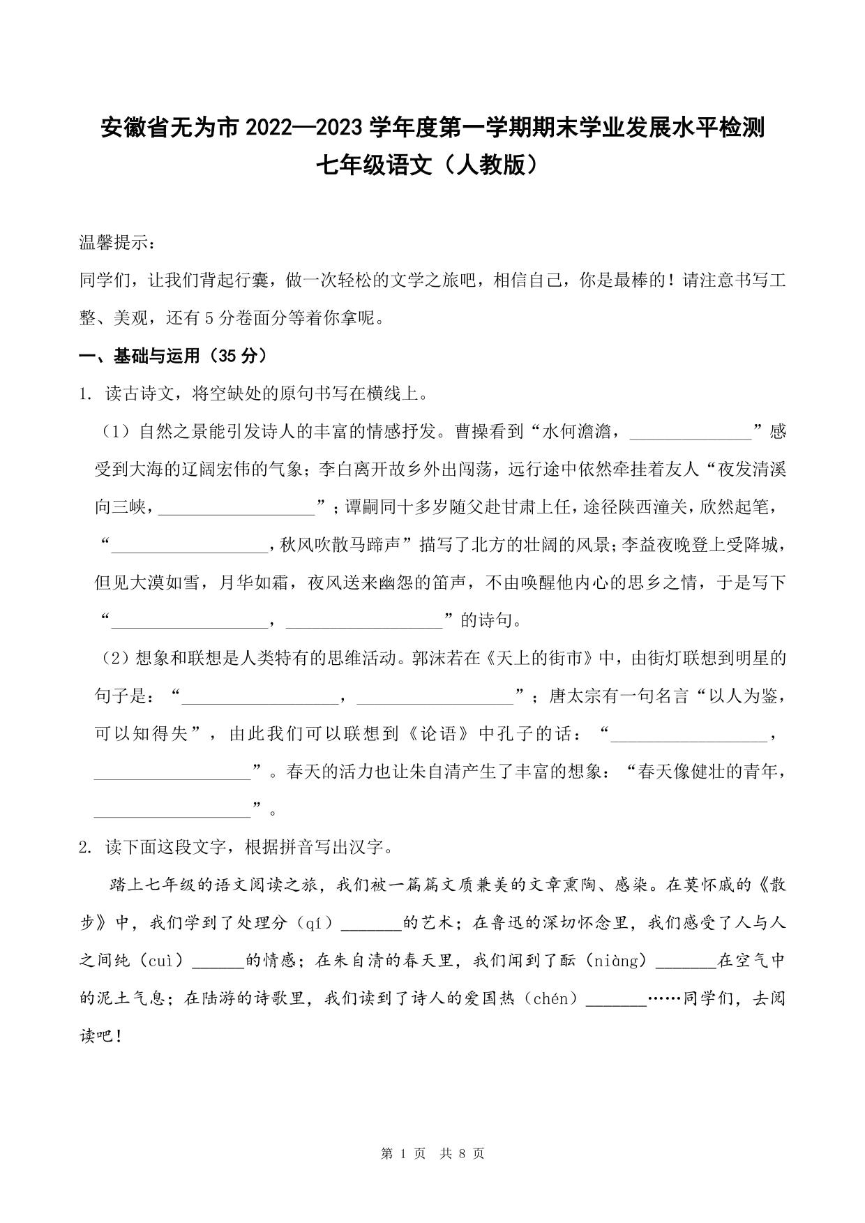 安徽省芜湖市无为市2022-2023学年度第一学期期末学业发展水平检测七年级语文(人教版)