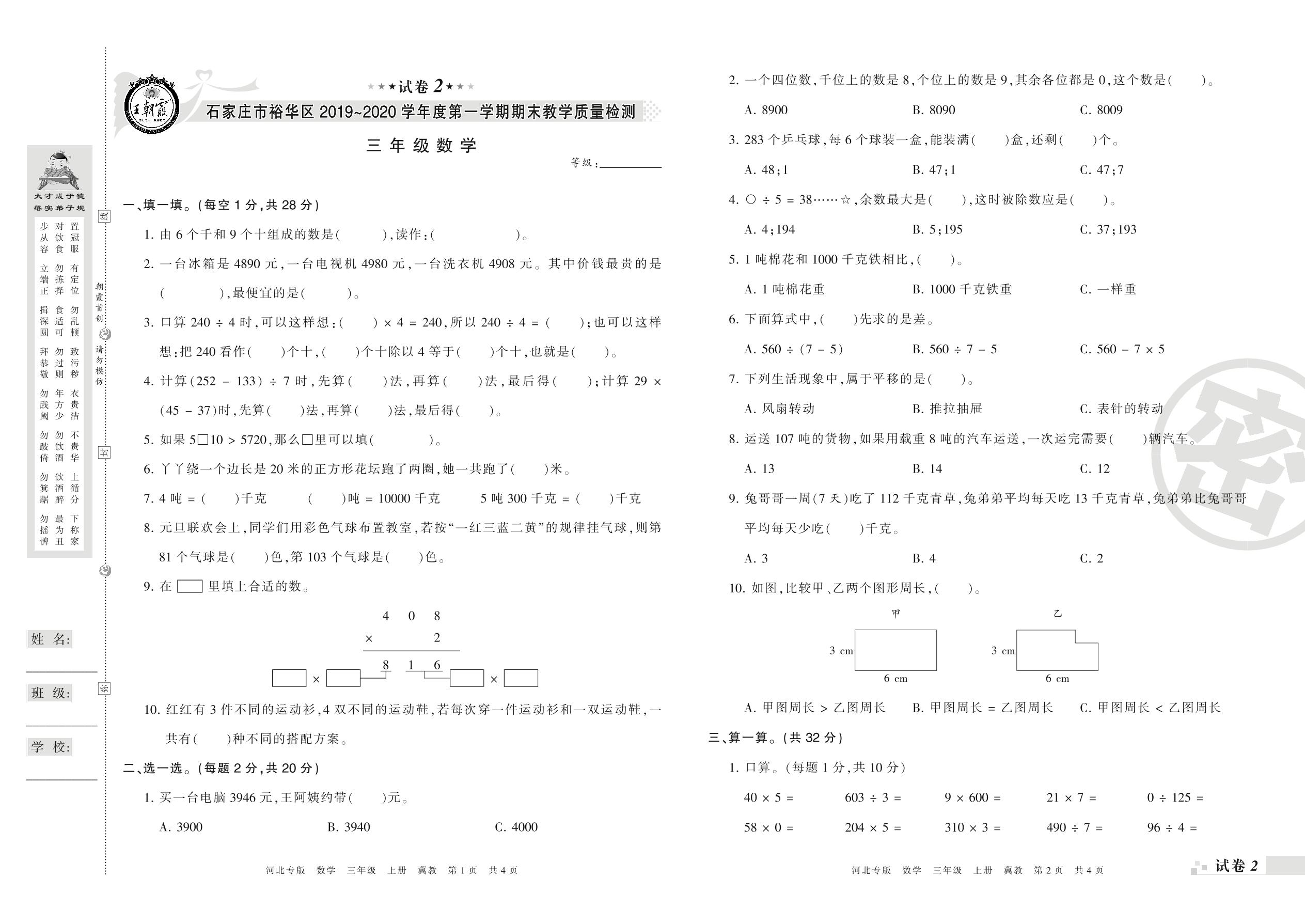 2019-2020学年第一学期石家庄市裕华区三年级数学试卷(冀教版)【2】